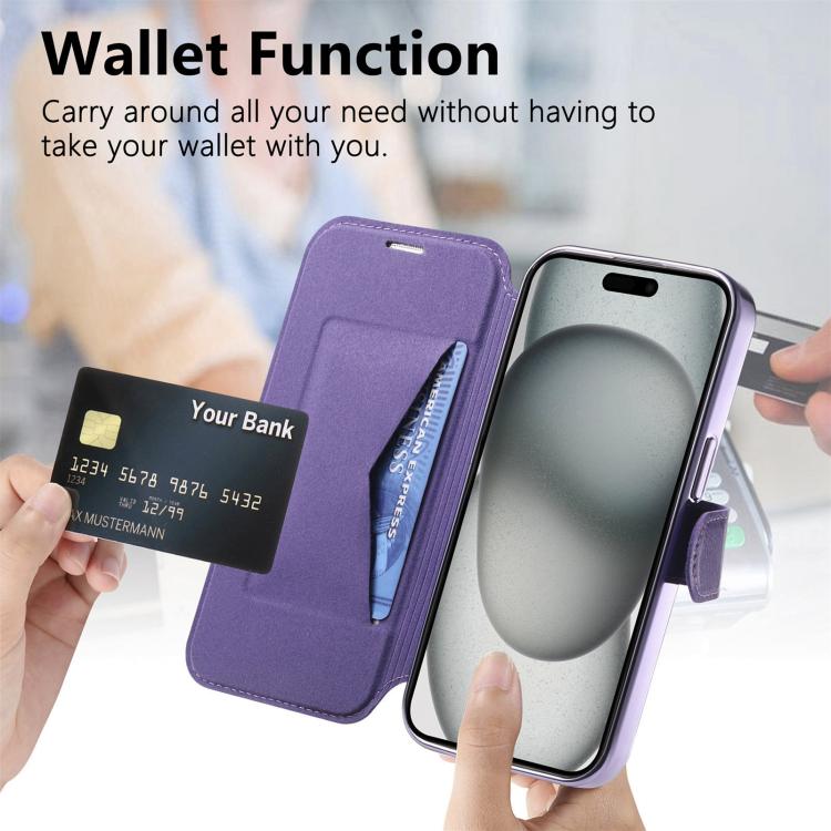 For iPhone 14 Splitable Electroplated MagSafe RFID Anti-theft Leather Phone Case with Lens Film(Purple)