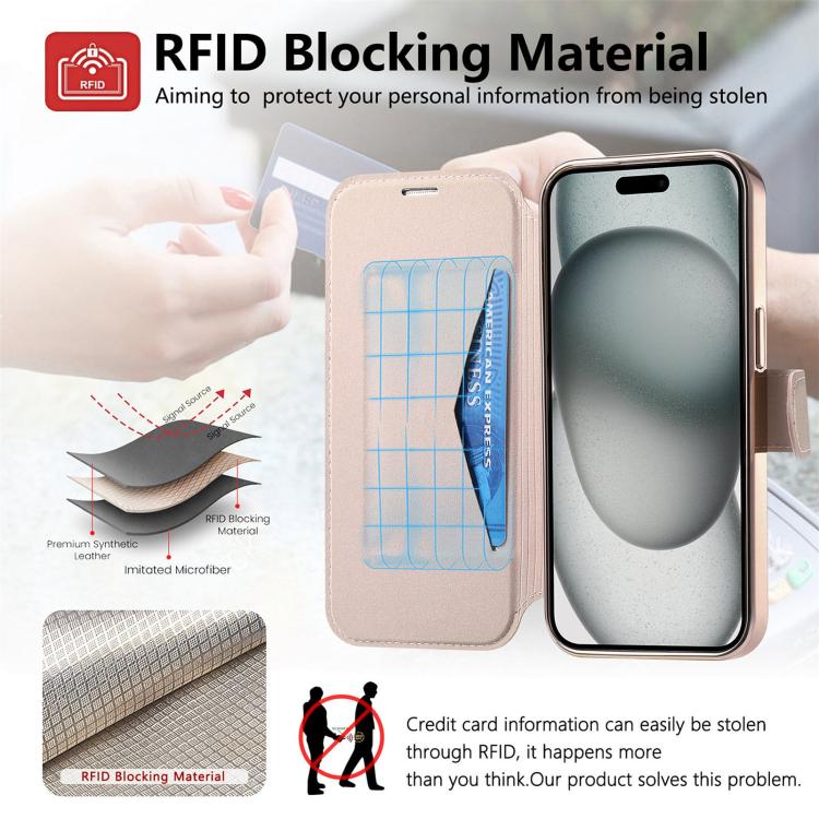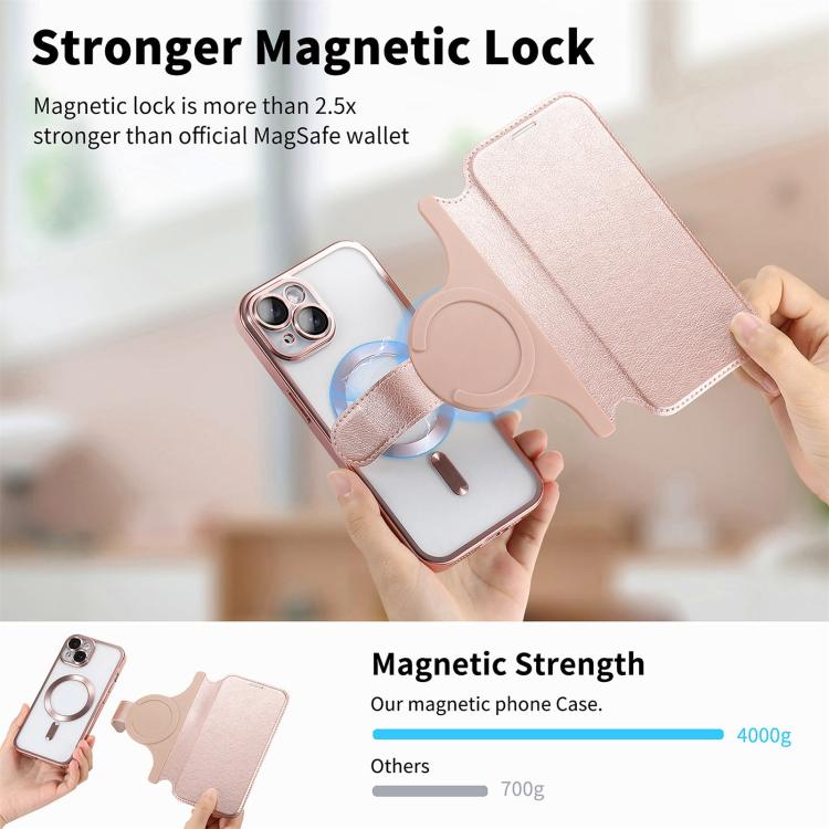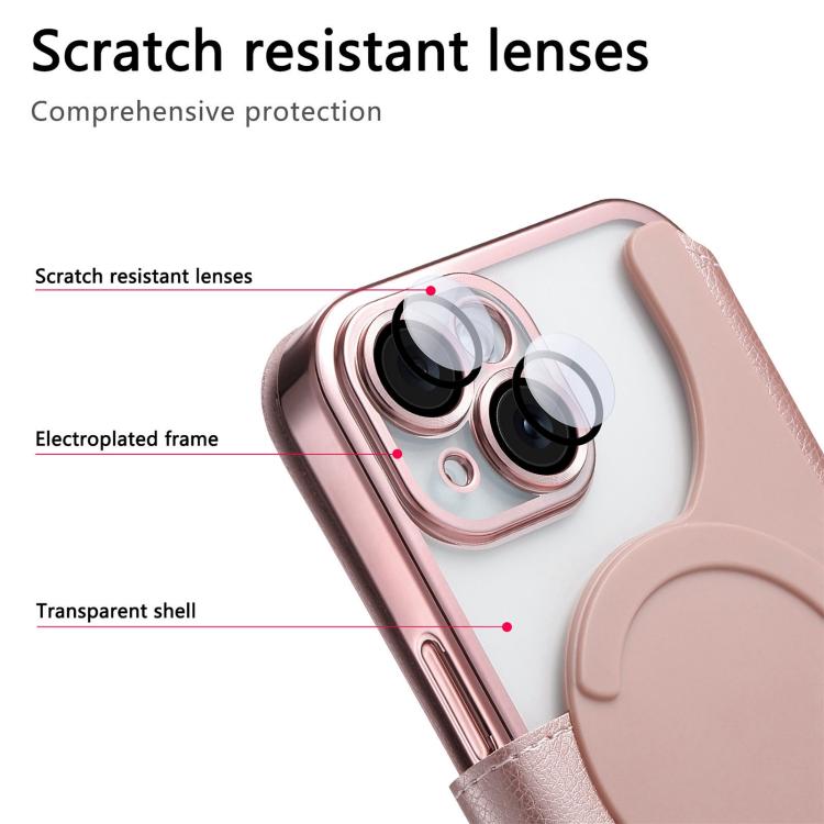 For iPhone 14 Splitable Electroplated MagSafe RFID Anti-theft Leather Phone Case with Lens Film(Rose Gold)