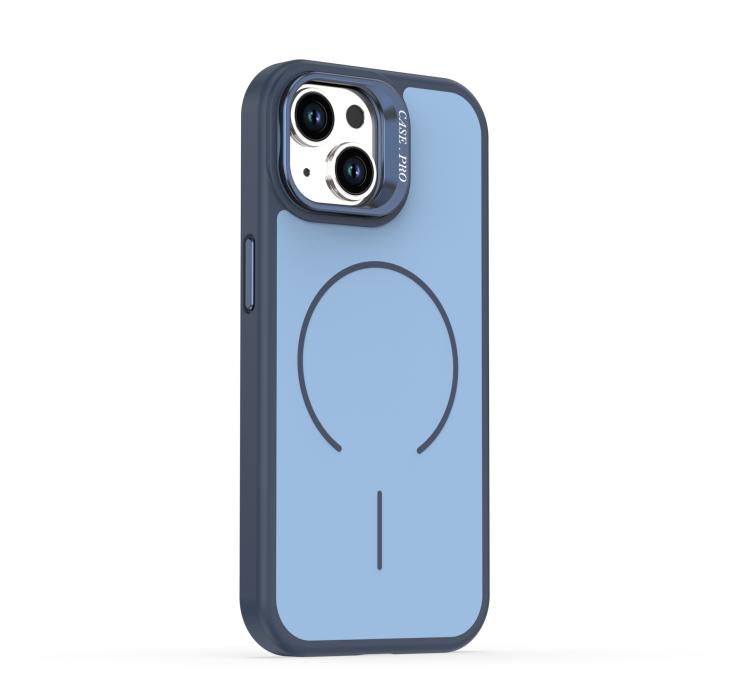 For iPhone 15 Bright Color Contrast Skin-feel Camera Bracket Magsafe Phone Case(Blue)