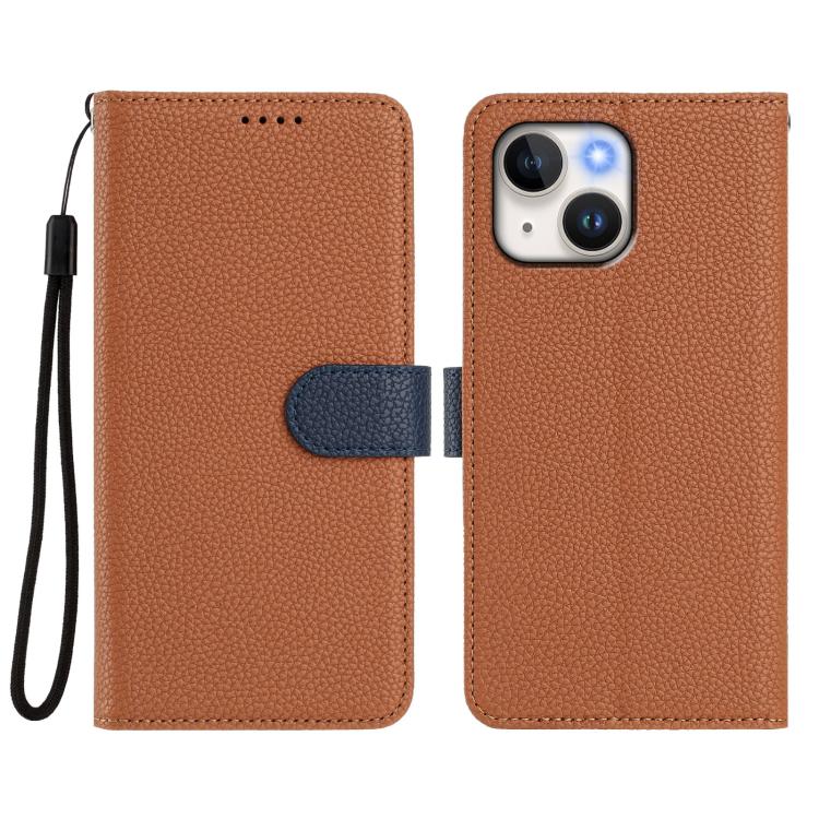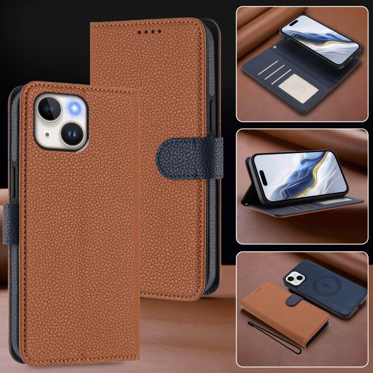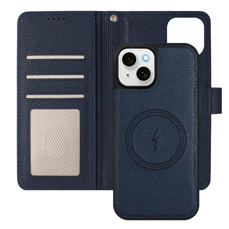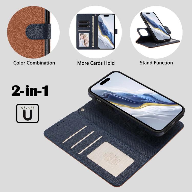 For iPhone 15 Detachable Litchi Texture Magnetic Side-Patch Vegan Leather Phone Case(Brown Dark Blue)