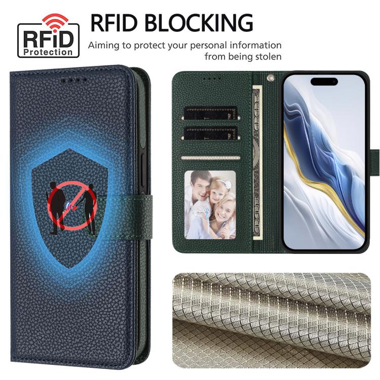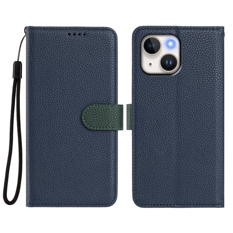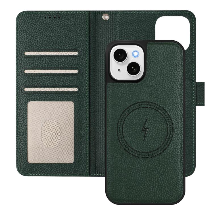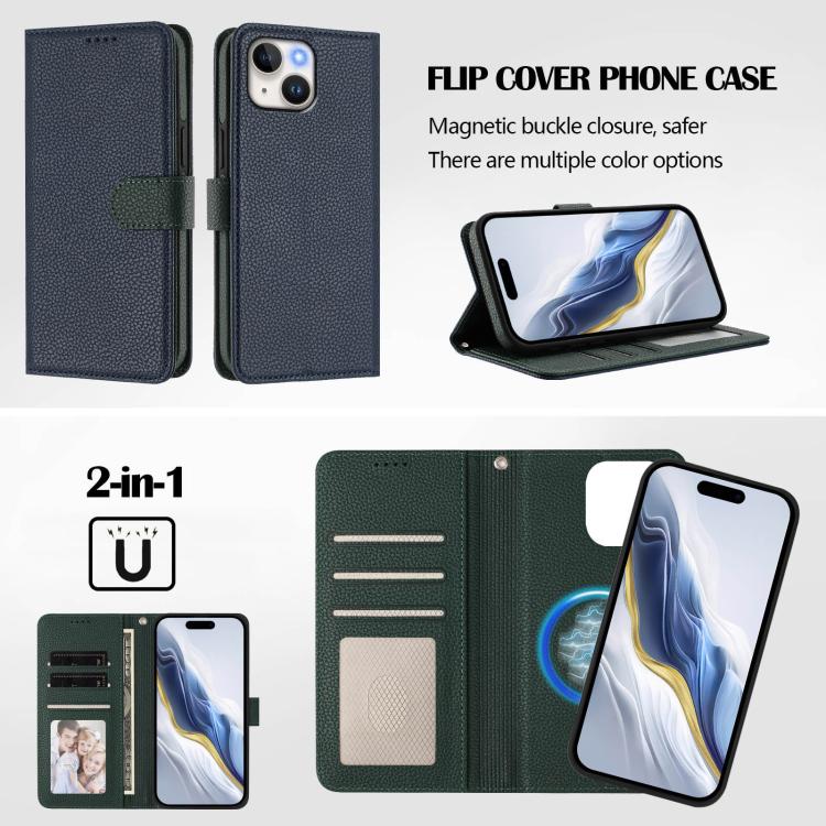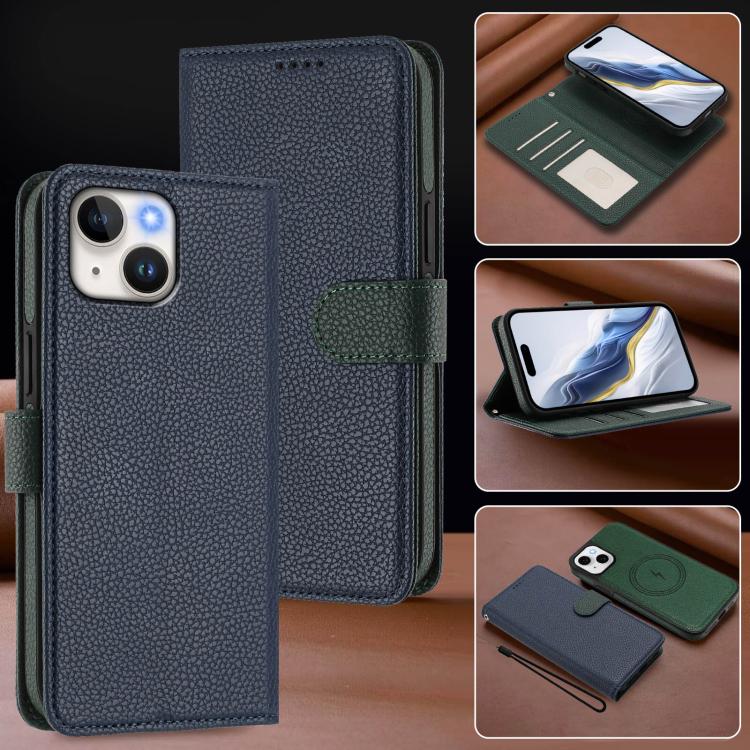 For iPhone 15 Detachable Litchi Texture Magnetic Side-Patch Vegan Leather Phone Case(Dark Blue Dark Green)