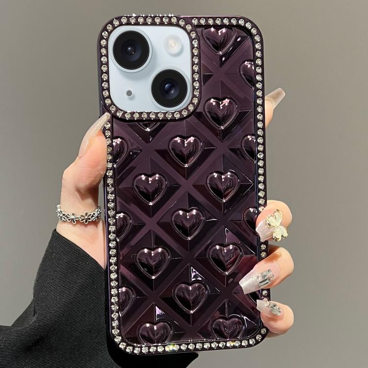 For iPhone 15 Electroplated Heart 3D Embossed Diamond TPU Phone Case(Purple)