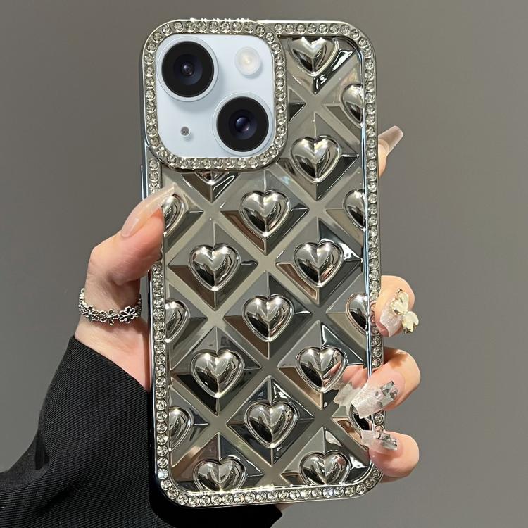 For iPhone 15 Electroplated Heart 3D Embossed Diamond TPU Phone Case(Silver)