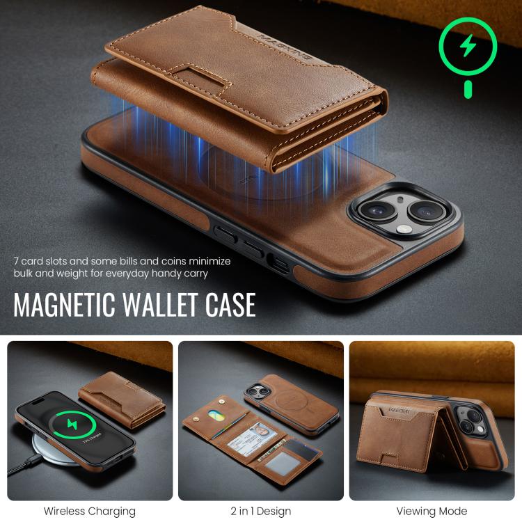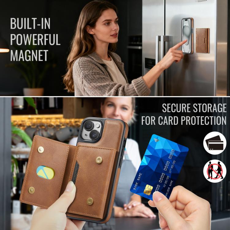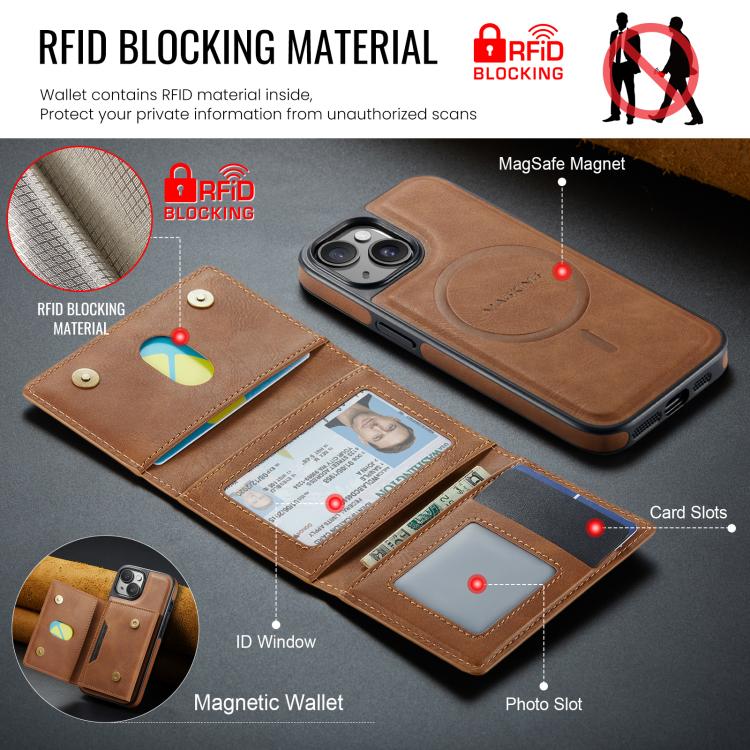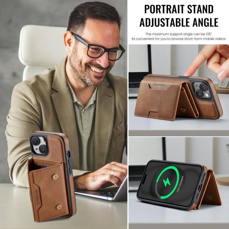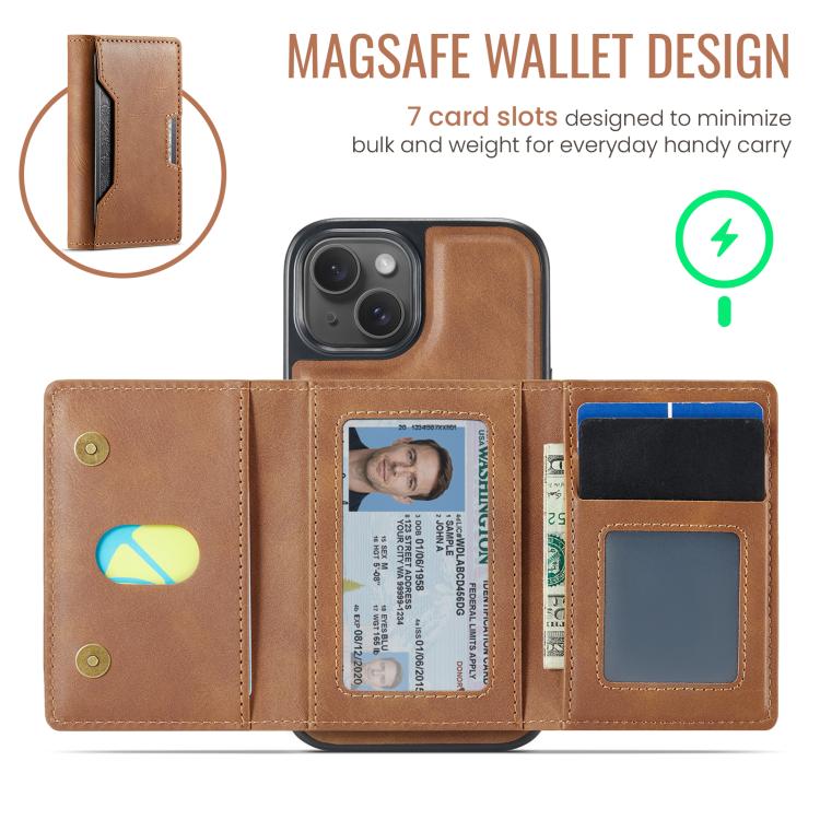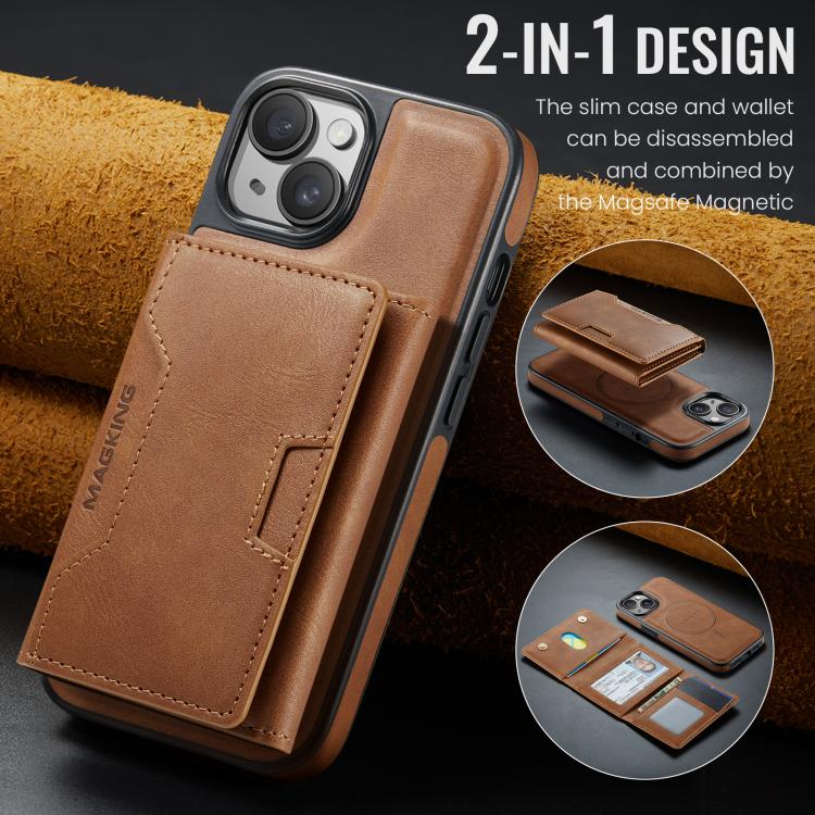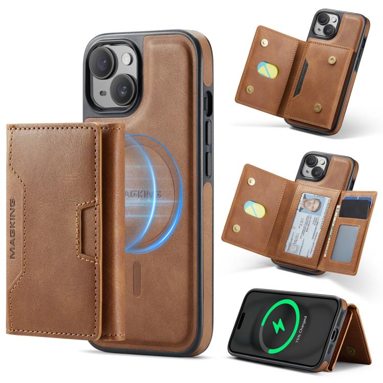 For iPhone 15 MAGKING K4 Series MagSafe RFID Tri-fold Card Bag Detachable Phone Case(Brown)