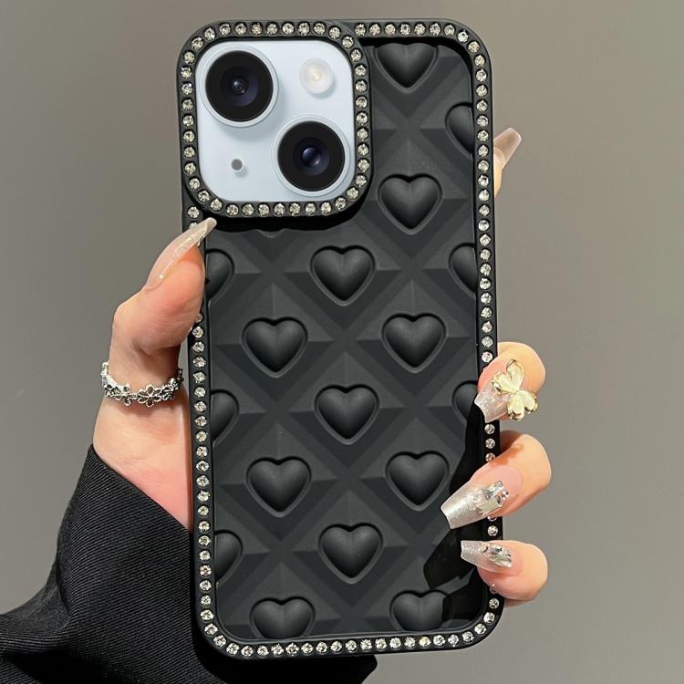 For iPhone 15 Oil-Sprayed Heart 3D Embossed Diamond TPU Phone Case(Black)