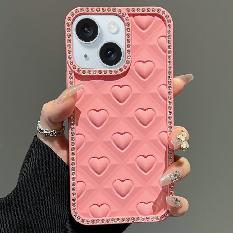 For iPhone 15 Oil-Sprayed Heart 3D Embossed Diamond TPU Phone Case(Pink)