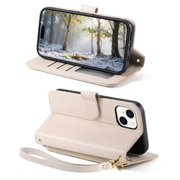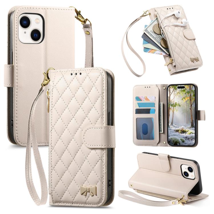 For iPhone 15 Rhombic Texture Zipper Wallet Metal Bow-knot Vegan Leather Phone Case with Strap(Beige)