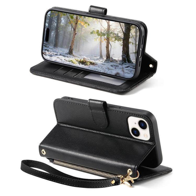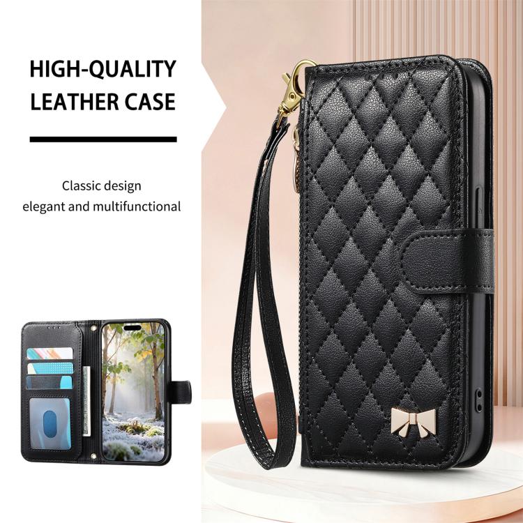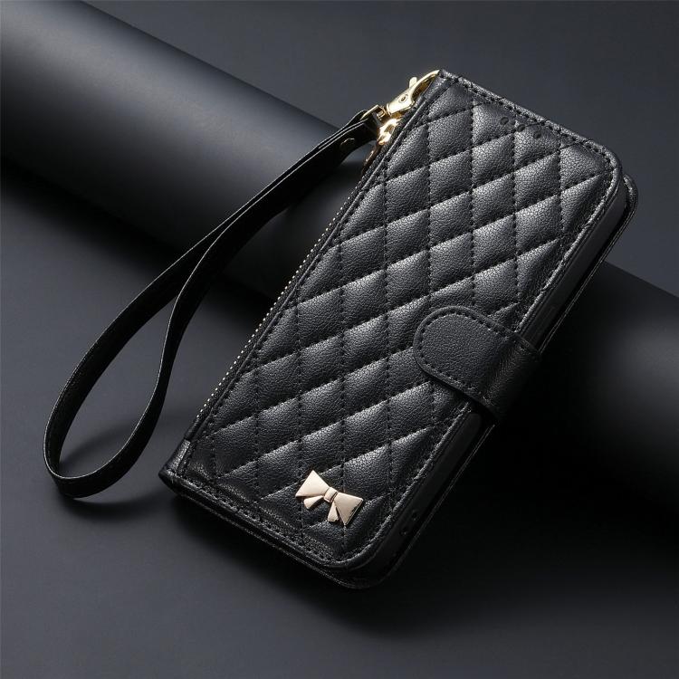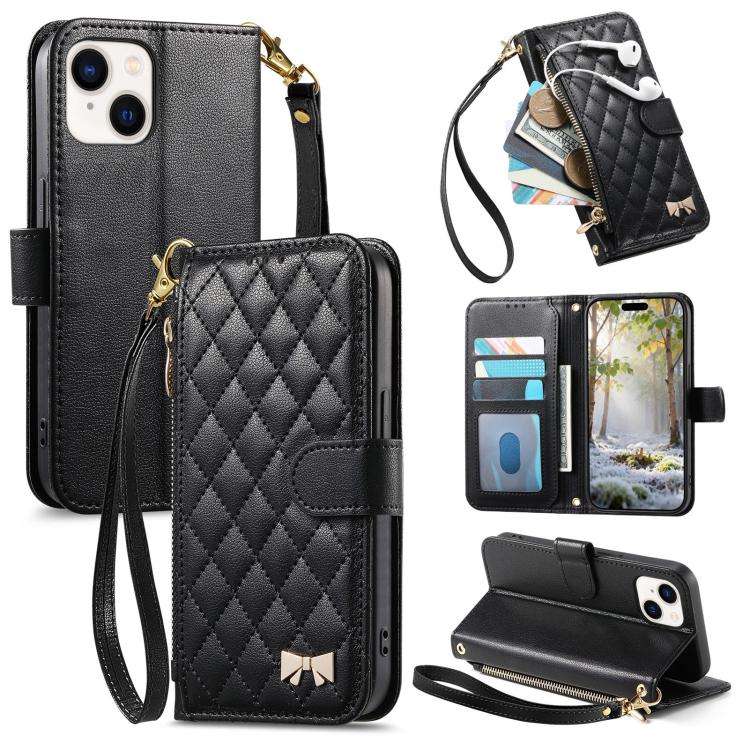 For iPhone 15 Rhombic Texture Zipper Wallet Metal Bow-knot Vegan Leather Phone Case with Strap(Black)