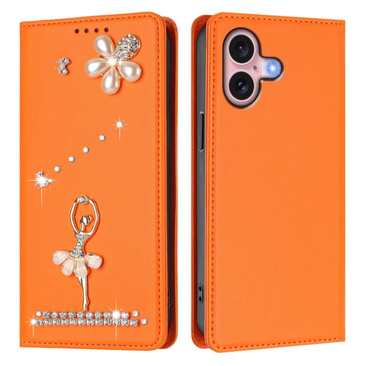 For iPhone 16 Ballet Girl Diamond Studded RFID Vegan Leather Phone Case(Orange)