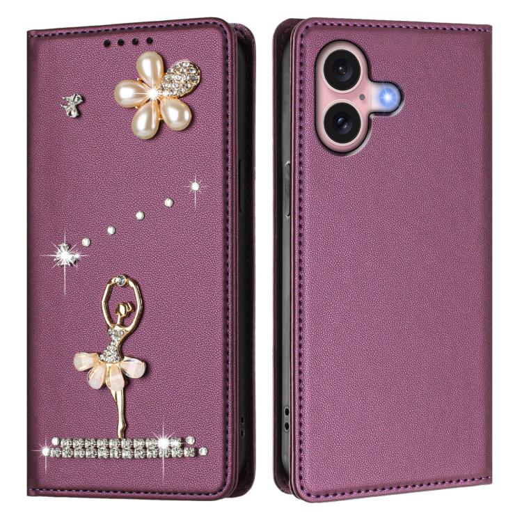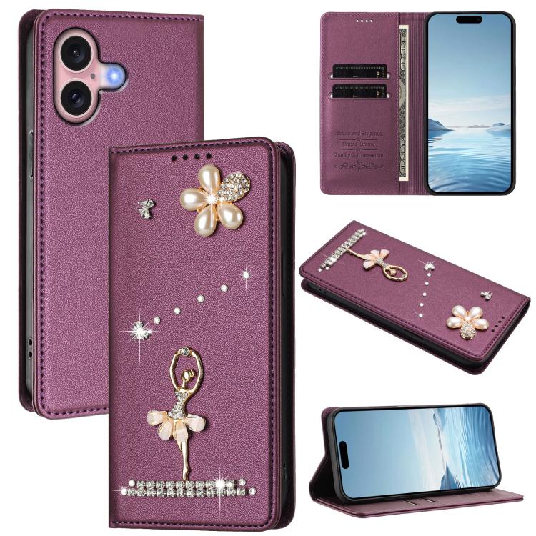 For iPhone 16 Ballet Girl Diamond Studded RFID Vegan Leather Phone Case(Violet)
