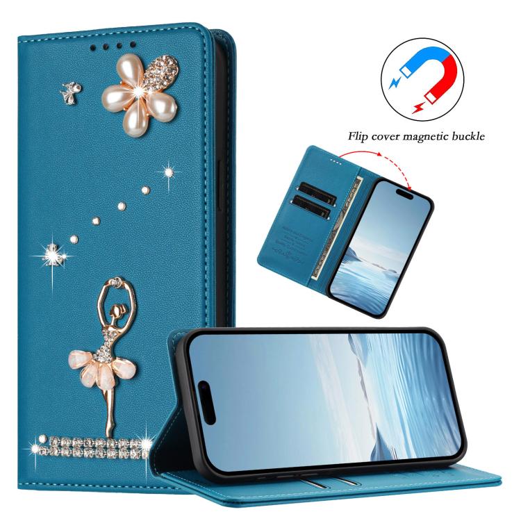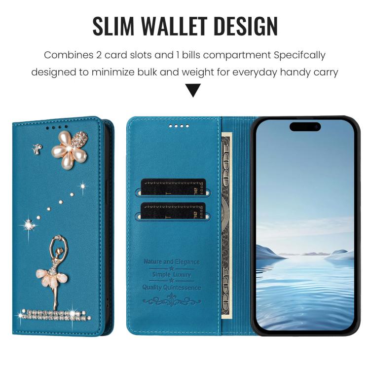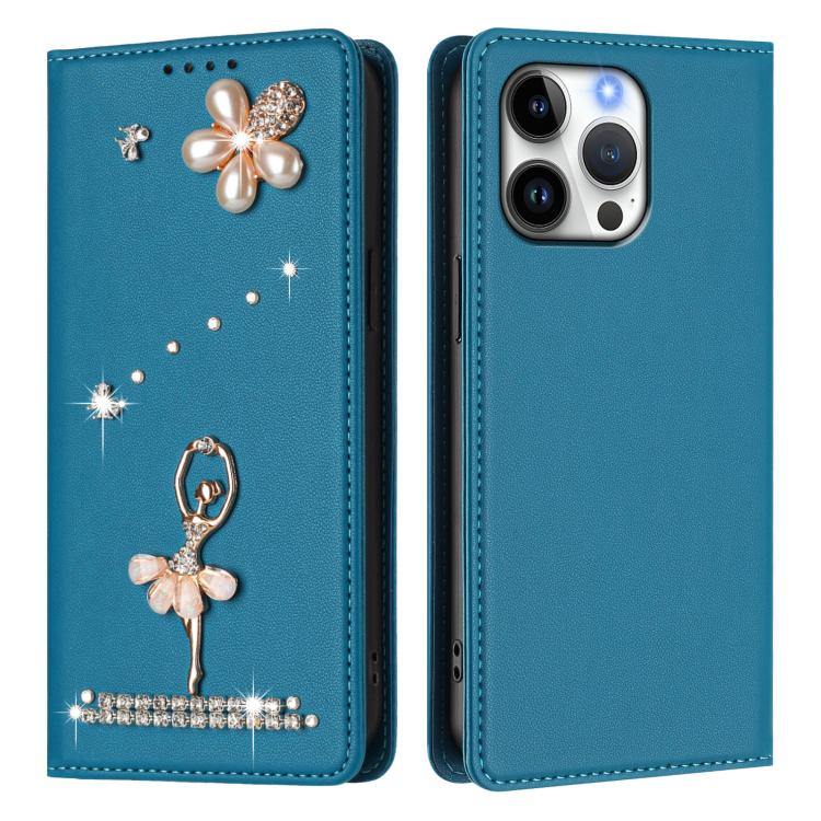 For iPhone 16 Pro Max Ballet Girl Diamond Studded RFID Vegan Leather Phone Case(Lake Blue)
