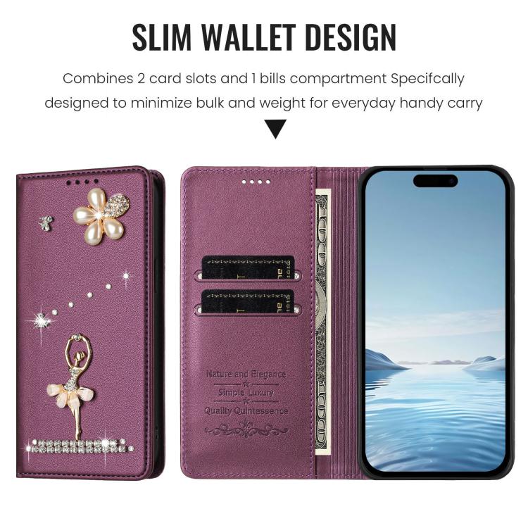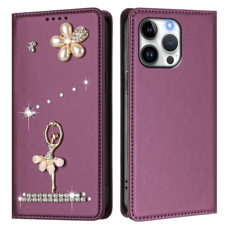 For iPhone 16 Pro Max Ballet Girl Diamond Studded RFID Vegan Leather Phone Case(Violet)