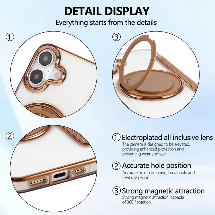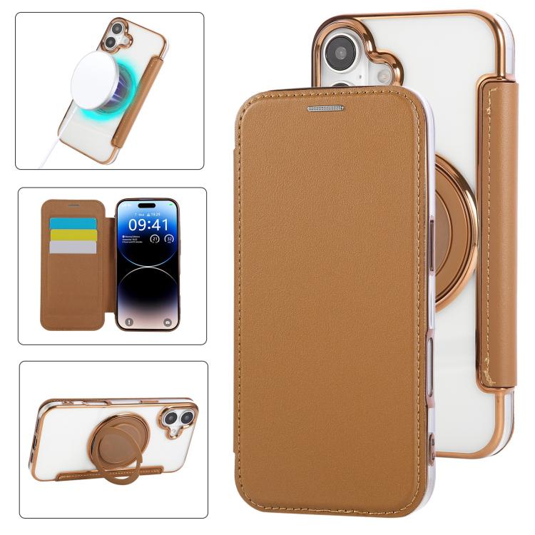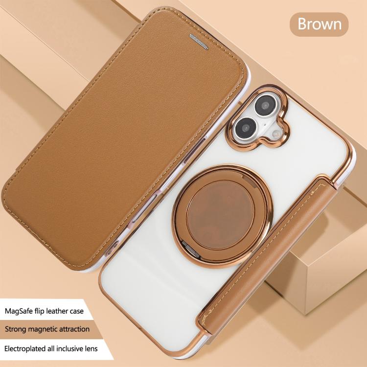 For iPhone 16 Ultra-thin Rotation Holder Magnetic Plating Vegan Leather Phone Case(Brown)