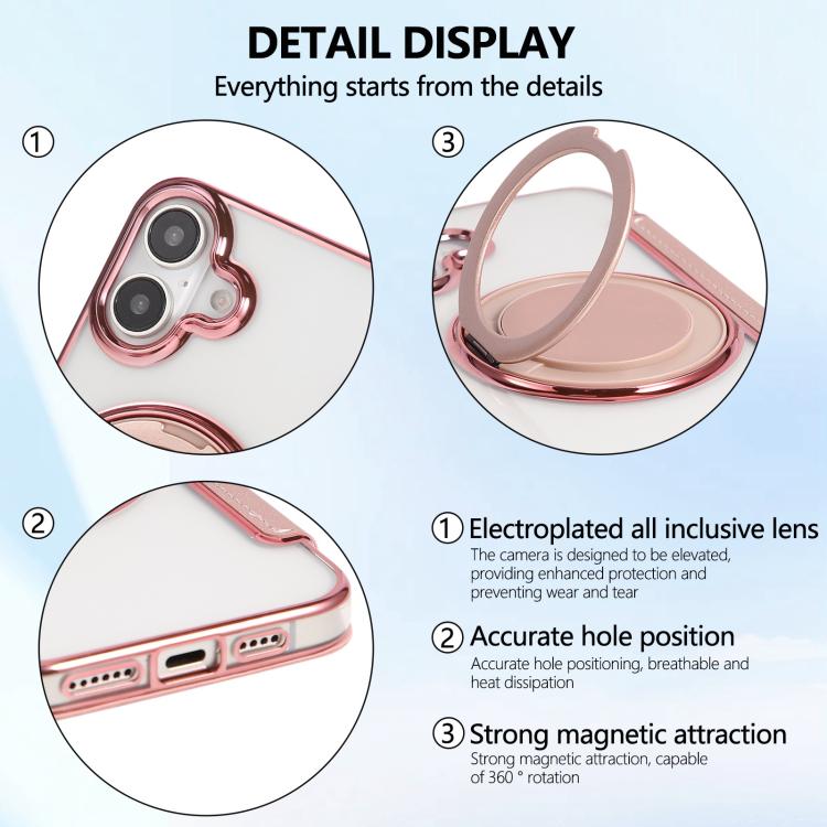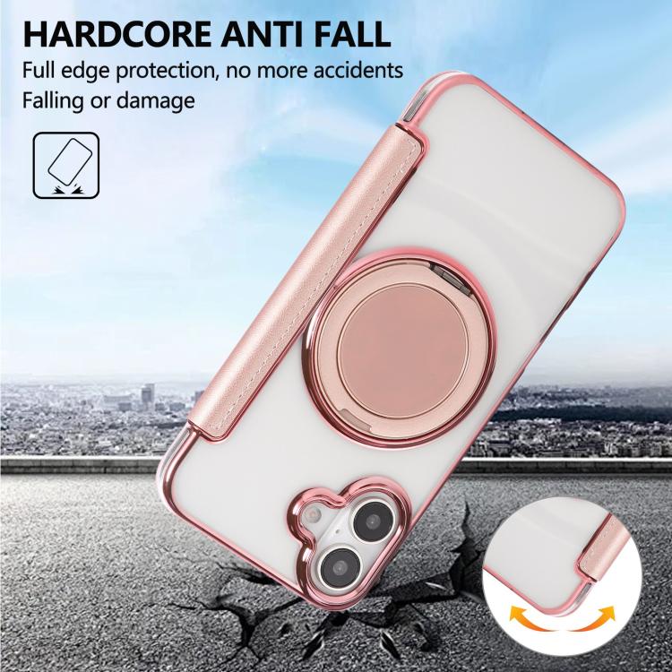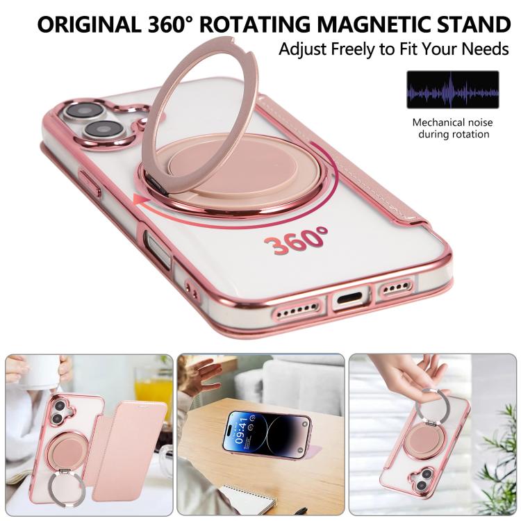 For iPhone 16 Ultra-thin Rotation Holder Magnetic Plating Vegan Leather Phone Case(Rose Gold)