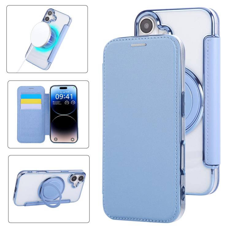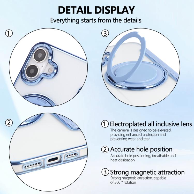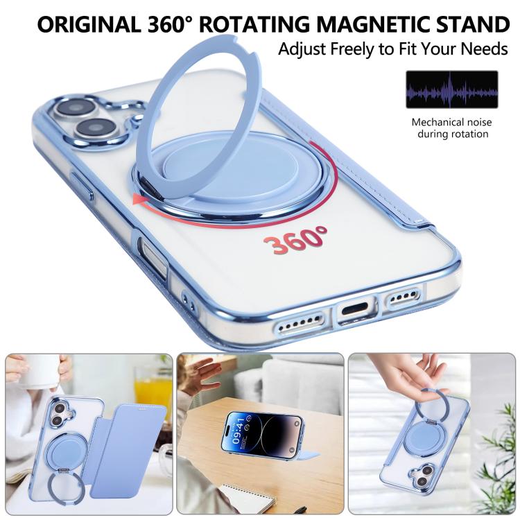 For iPhone 16 Ultra-thin Rotation Holder Magnetic Plating Vegan Leather Phone Case(Sierra Blue)