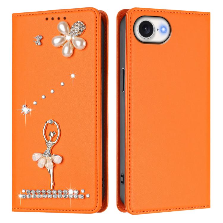For iPhone 16e Ballet Girl Diamond Studded RFID Vegan Leather Phone Case(Orange)