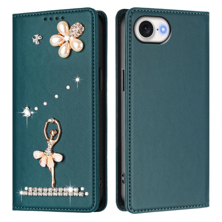 For iPhone 16e Ballet Girl Diamond Studded RFID Vegan Leather Phone Case(Peacock Green)