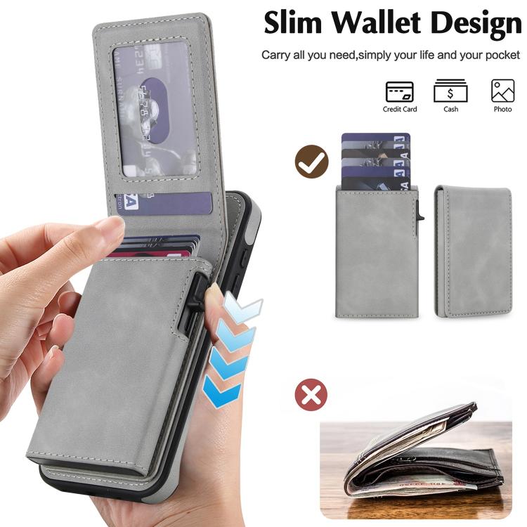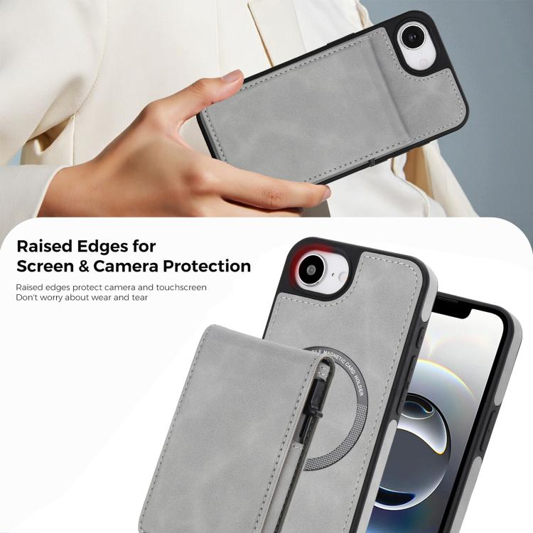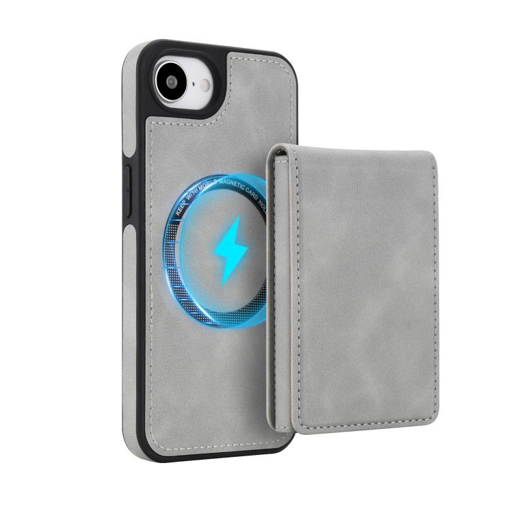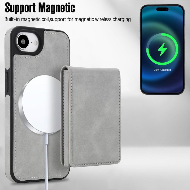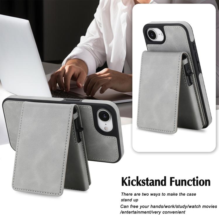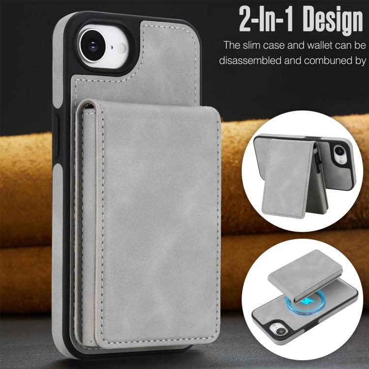 For iPhone 16e Retro Faux Leather Detachable Spring Loaded Card Bag Magnetic RFID Phone Case(Gray)