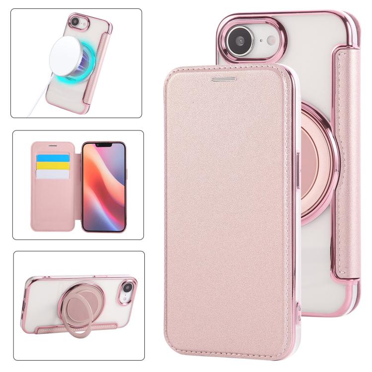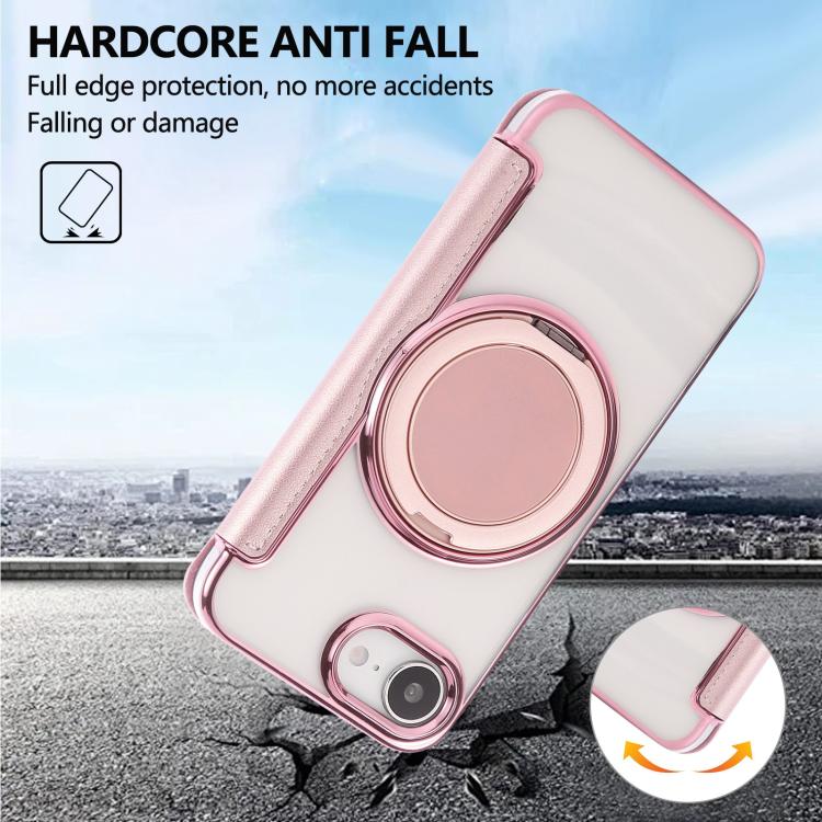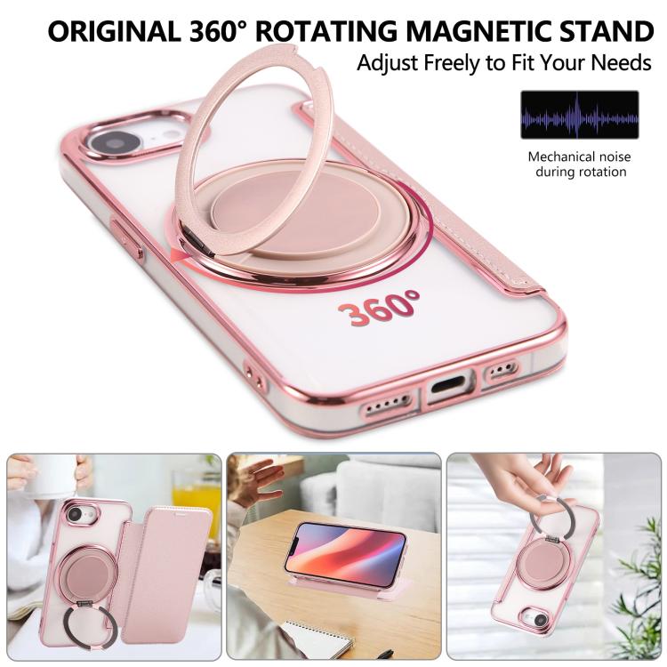 For iPhone 16e Ultra-thin Rotation Holder Magnetic Plating Vegan Leather Phone Case(Rose Gold)