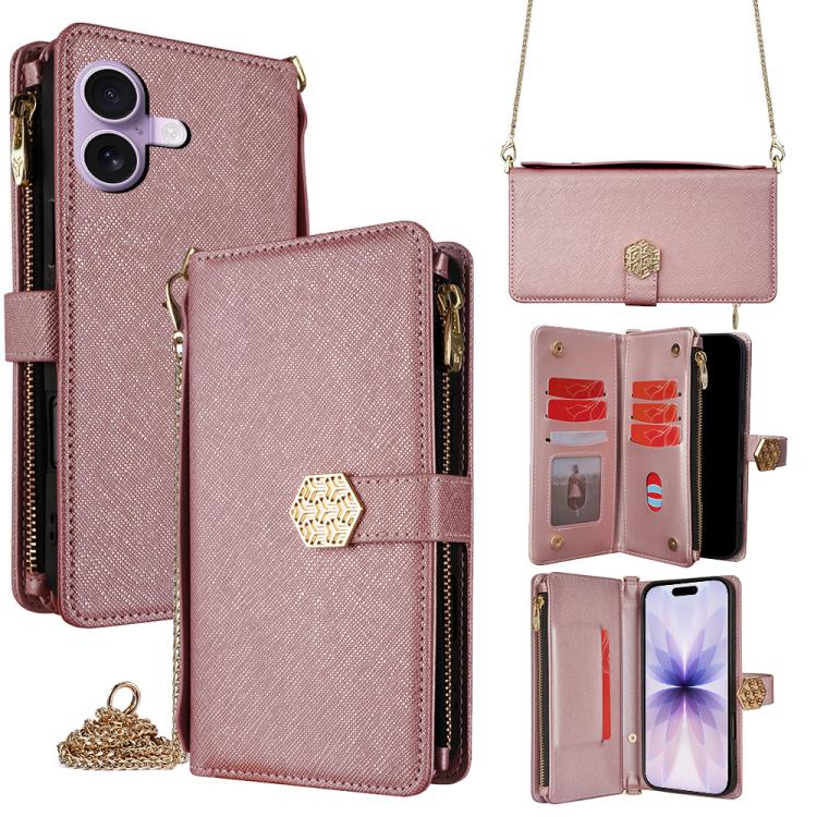 For iPhone 17 Crossbody Handle Cross Texture Leather Phone Case(Rose Gold)