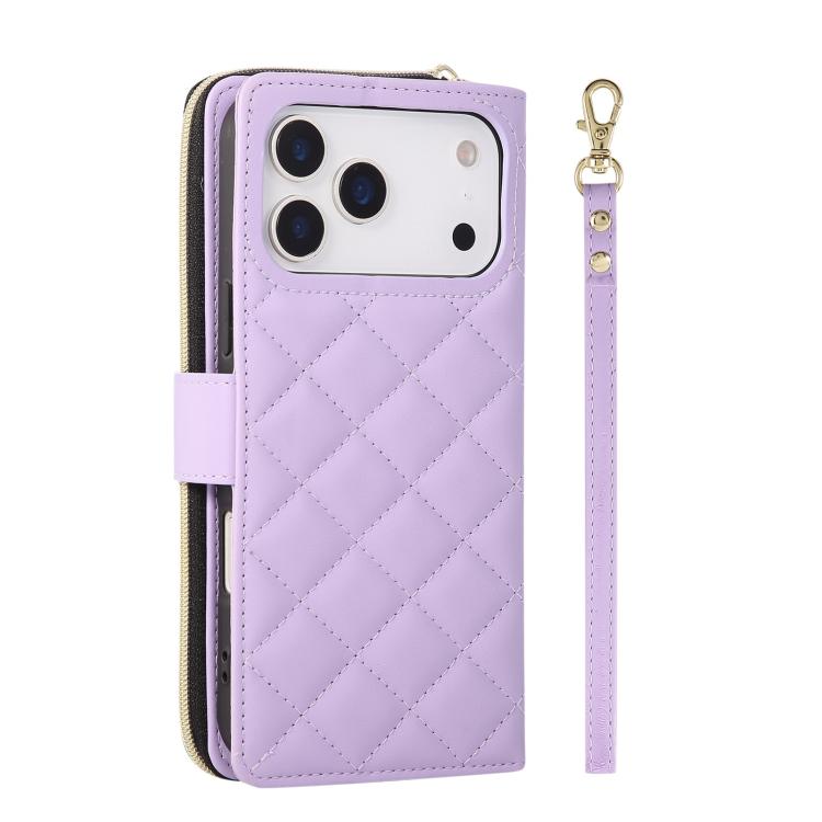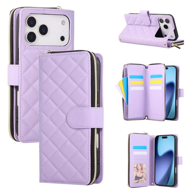 For iPhone 17 Pro Max Crossbody Rhombic Zipper Tower Buckle Leather Phone Case with Lanyard(Purple)