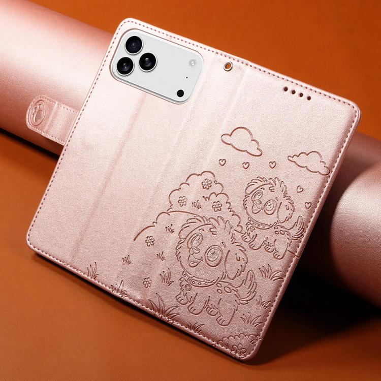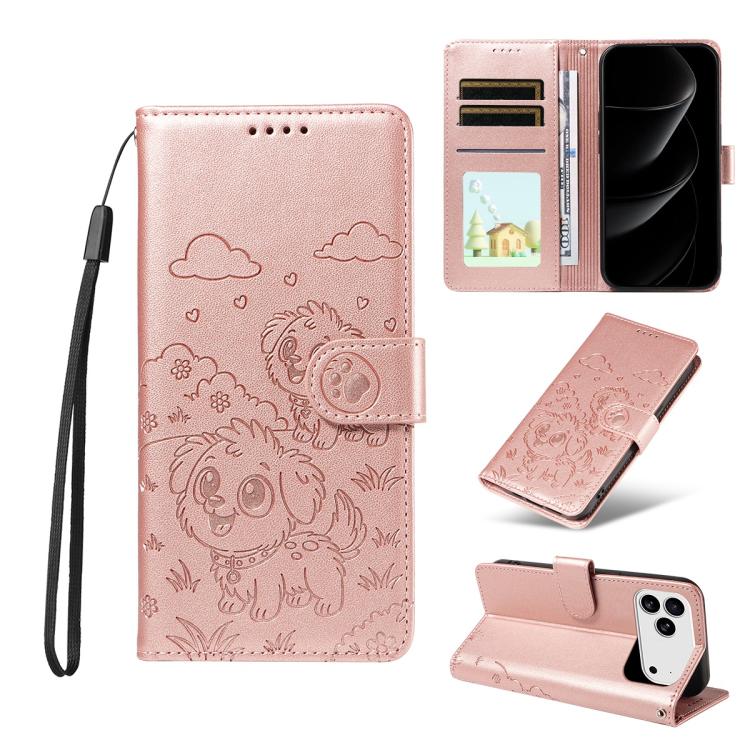 For iPhone 17 Pro Max Embossed Heart Dog RFID Blocking Wallet Leather Phone Case(Rose Gold)