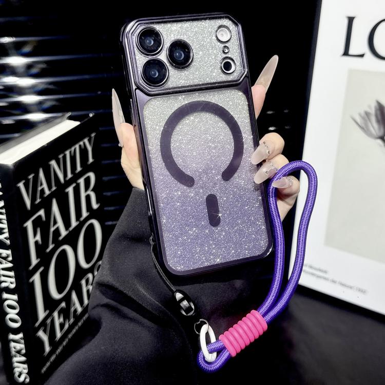 For iPhone 17 Pro Max Large Window Glitter Gradient Matte Electroplated TPU MagSafe Phone Case with Hand Strap(Purple)