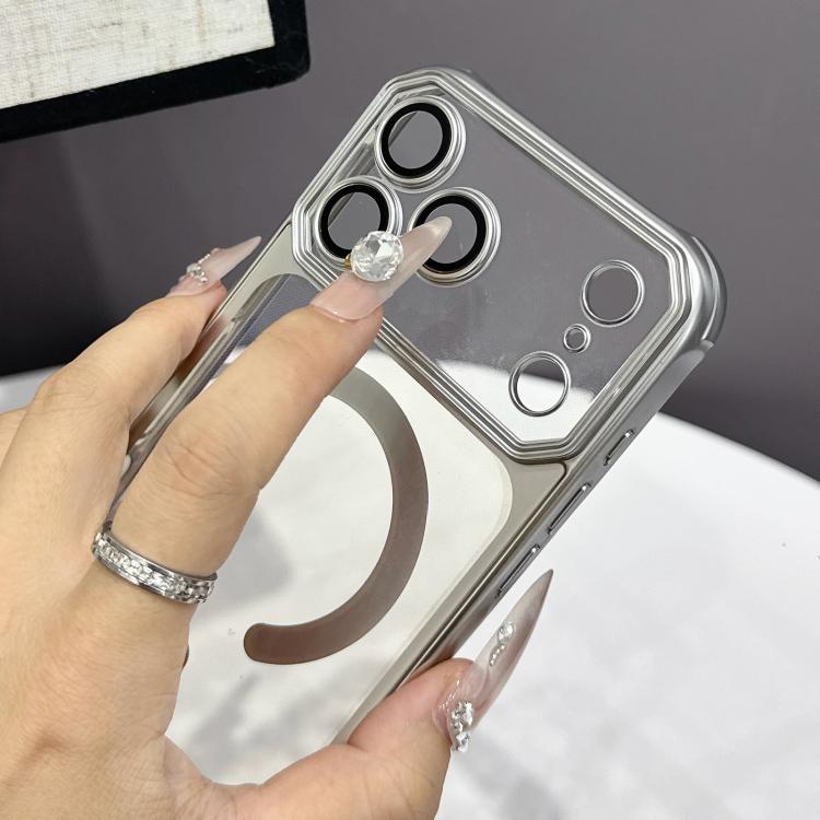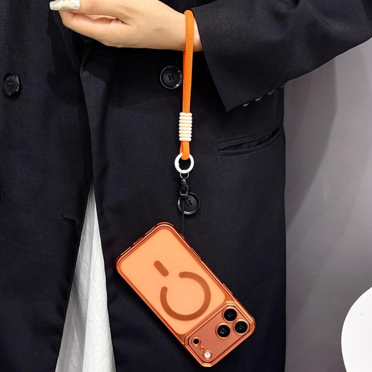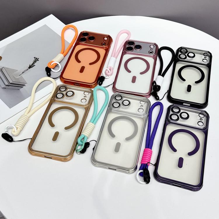 For iPhone 17 Pro Max Large Window Matte Electroplated TPU MagSafe Phone Case with Hand Strap(Pink)