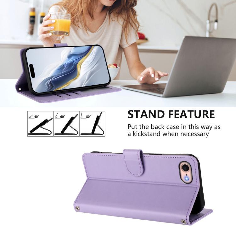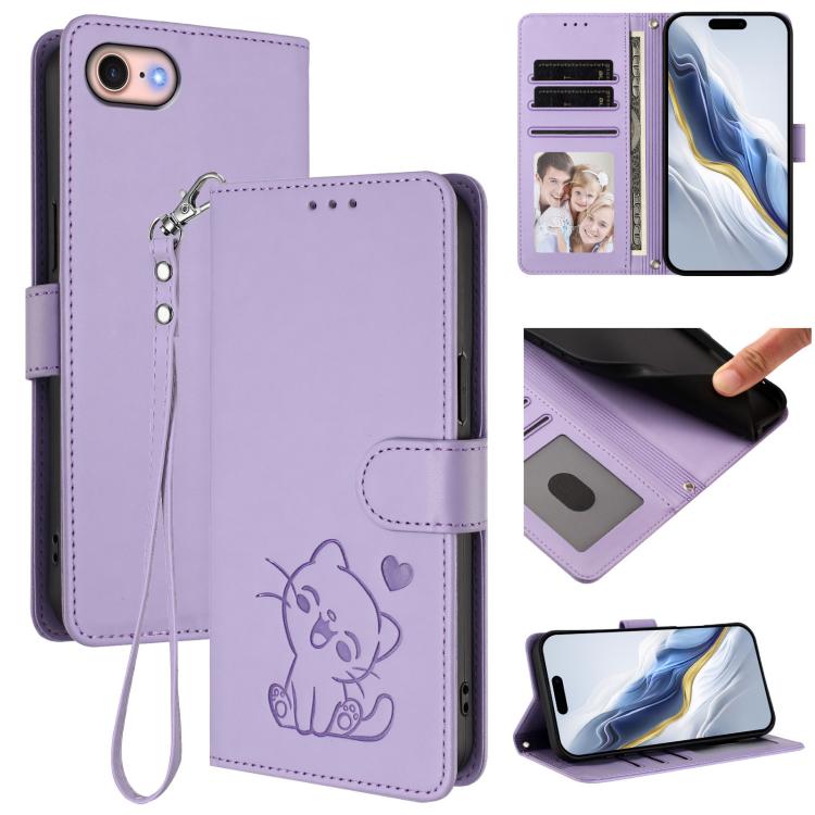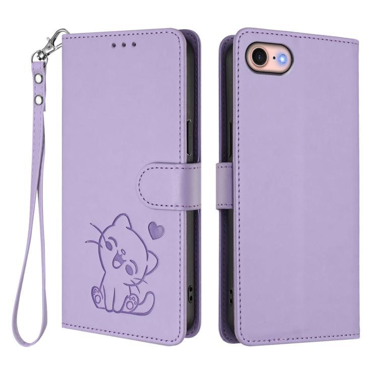 For iPhone 7 / 8 / SE 2022 Embossed Heart Cat Leather Phone Case with Hand Strap(Light Purple)