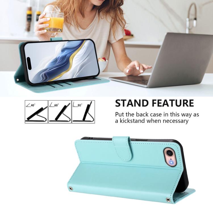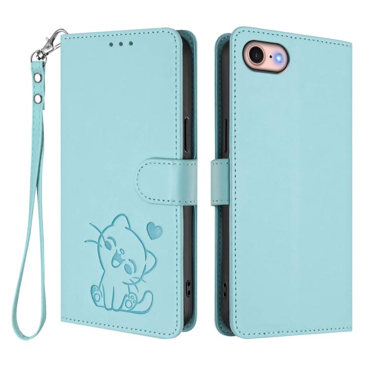For iPhone 7 / 8 / SE 2022 Embossed Heart Cat Leather Phone Case with Hand Strap(Mint Green)