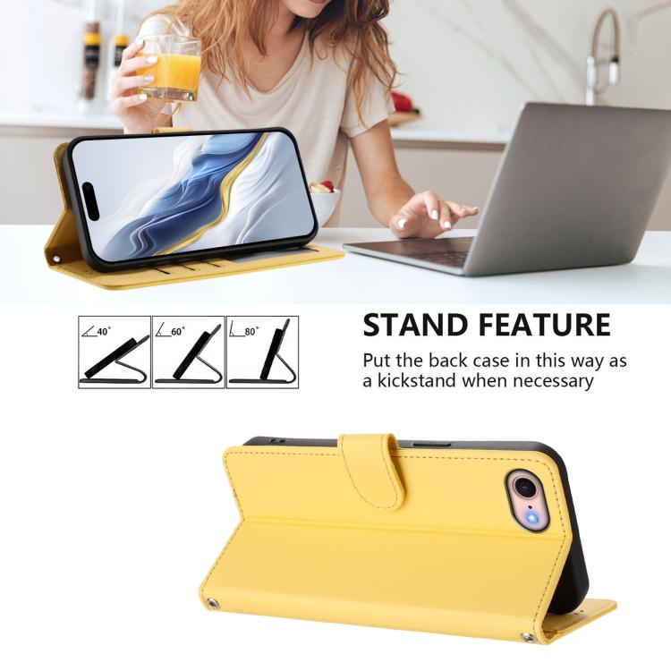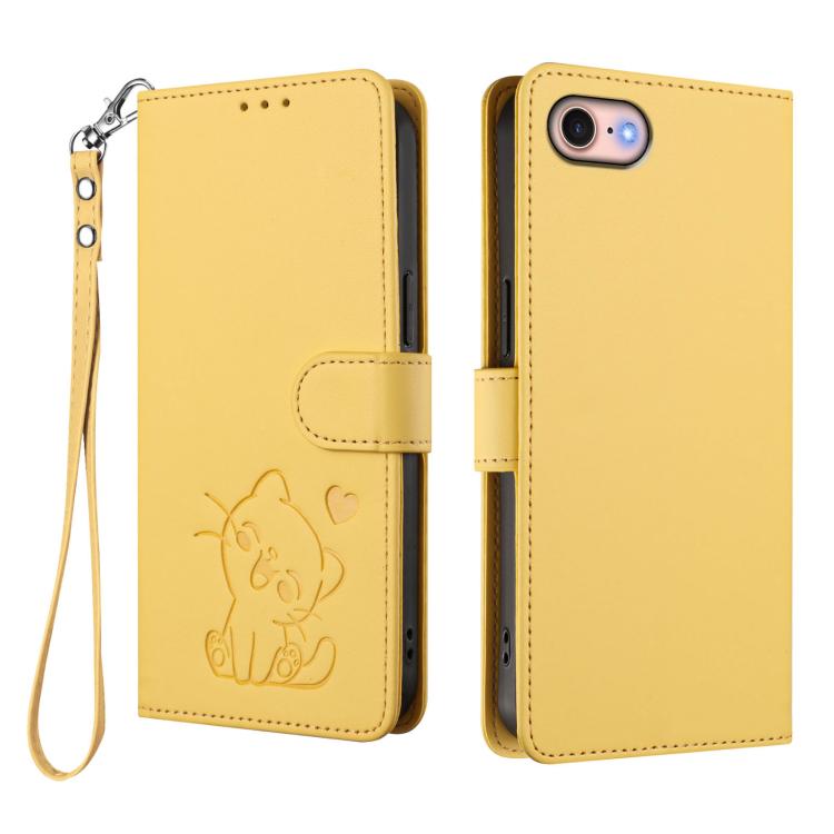 For iPhone 7 / 8 / SE 2022 Embossed Heart Cat Leather Phone Case with Hand Strap(Yellow)