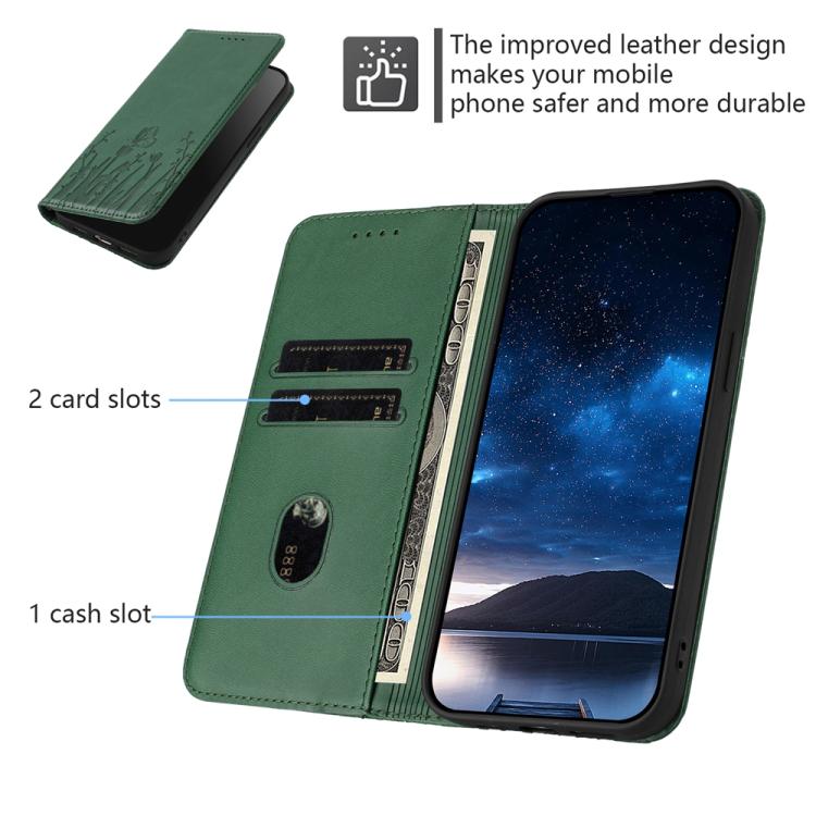 For iPhone SE 2022 / SE 2020 / 7 / 8 Tulips Butterfly Pattern Magnetic Vegan Leather Phone Case(Dark Green)