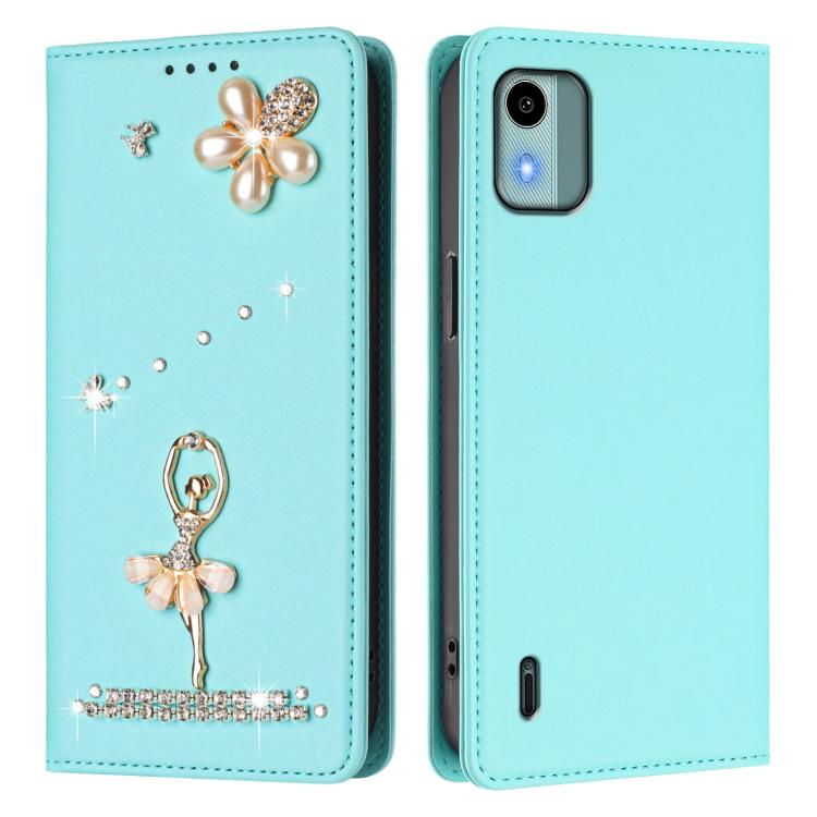 For Nokia C12 Ballet Girl Diamond Studded RFID Vegan Leather Phone Case(Mint Green)
