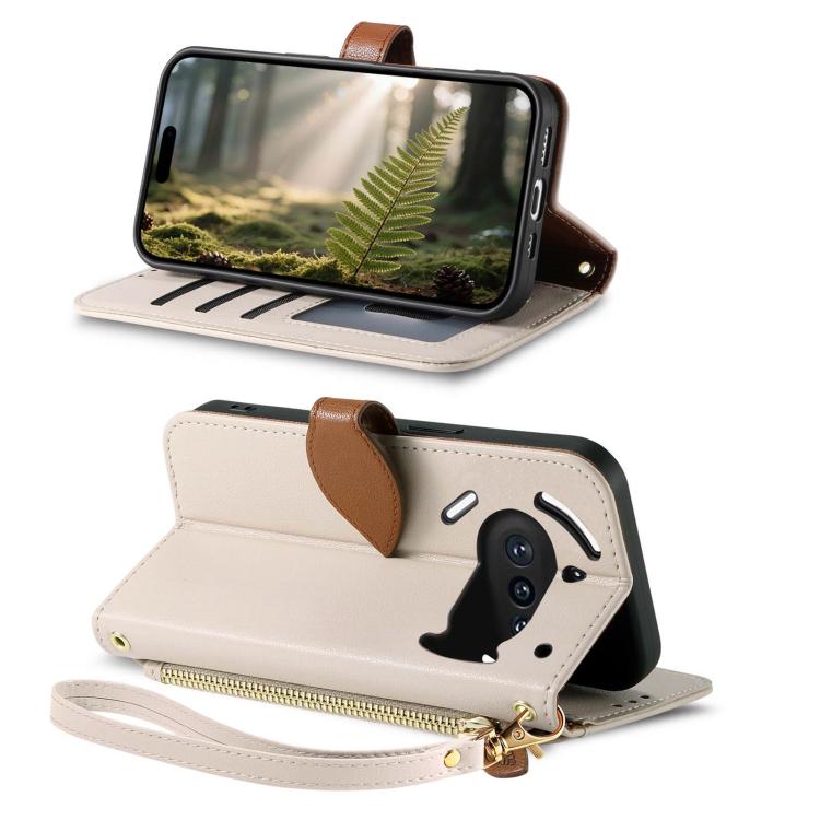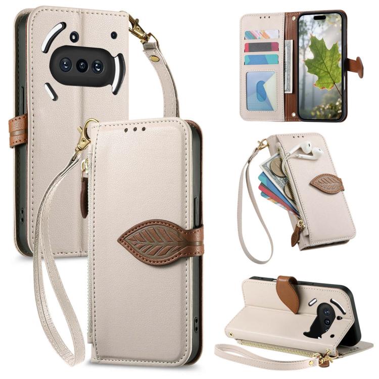 For Nothing Phone 3a Leaf Buckle Zipper Wallet Leather Phone Case with Strap(Beige)