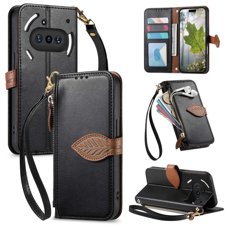 For Nothing Phone 3a Leaf Buckle Zipper Wallet Leather Phone Case with Strap(Black)