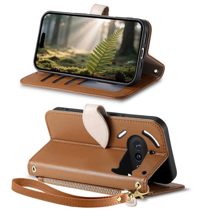 For Nothing Phone 3a Leaf Buckle Zipper Wallet Leather Phone Case with Strap(Brown)