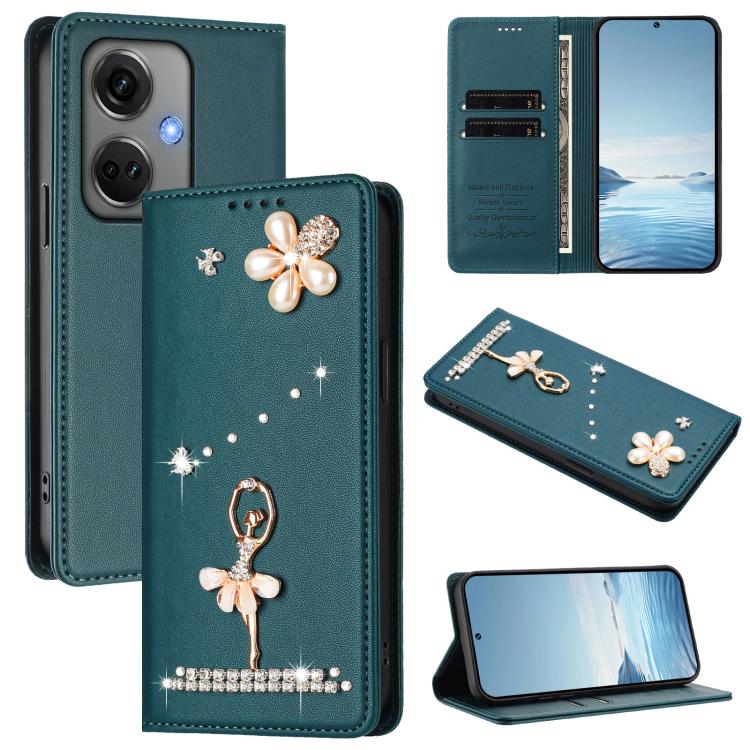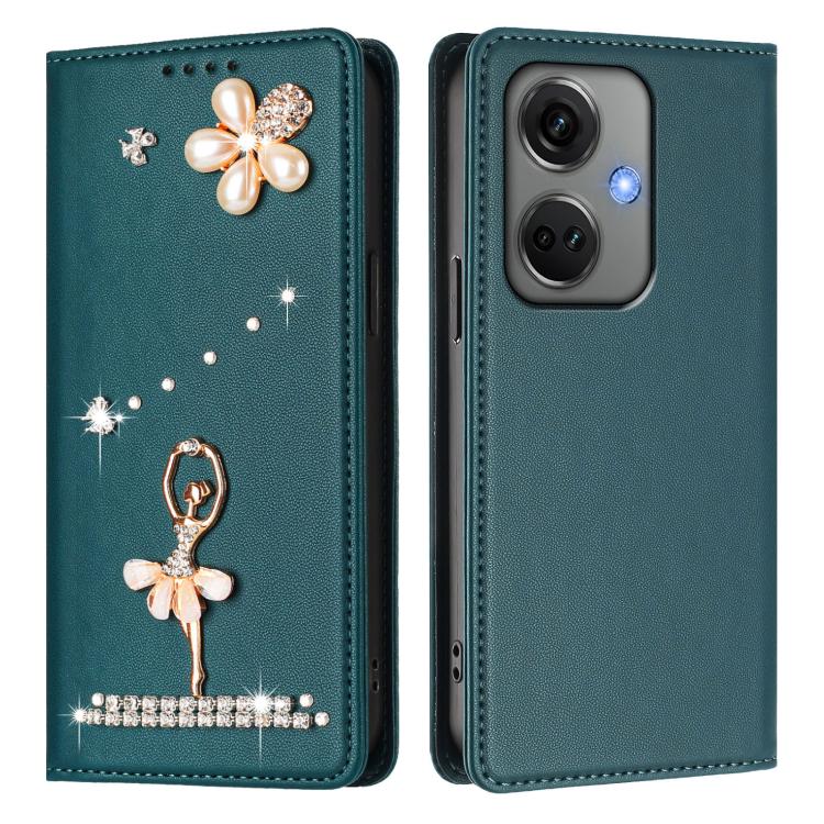 For OnePlus Nord CE3 5G India Ballet Girl Diamond Studded RFID Vegan Leather Phone Case(Peacock Green)