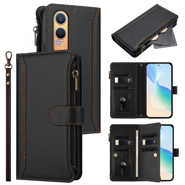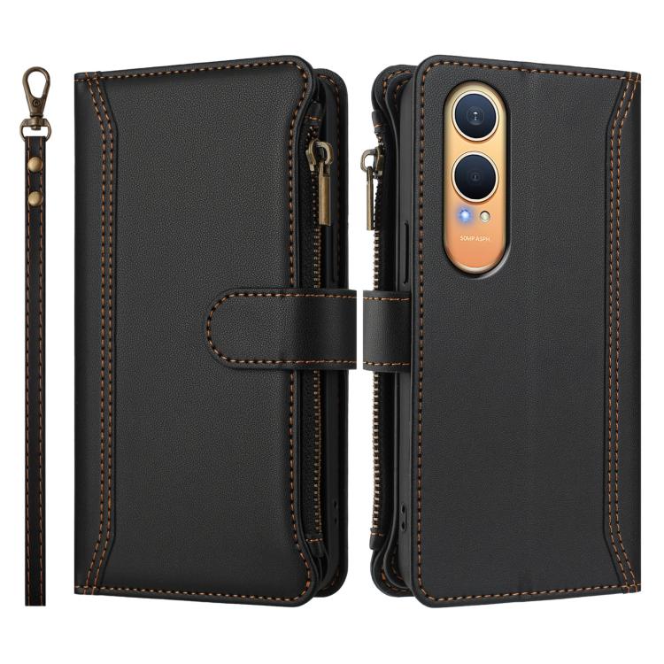 For OnePlus Nord CE4 Lite 5G Global Magnetic Closure 9 Card Slots Zipper Leather Case with Hand Strap(Black)