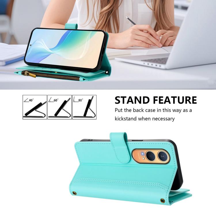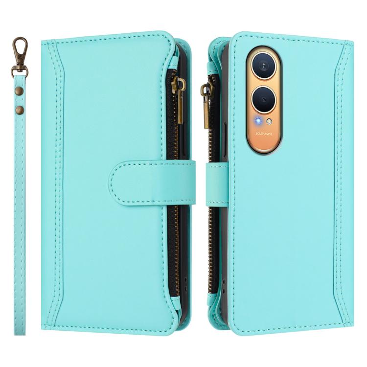 For OnePlus Nord CE4 Lite 5G Global Magnetic Closure 9 Card Slots Zipper Leather Case with Hand Strap(Mint Green)
