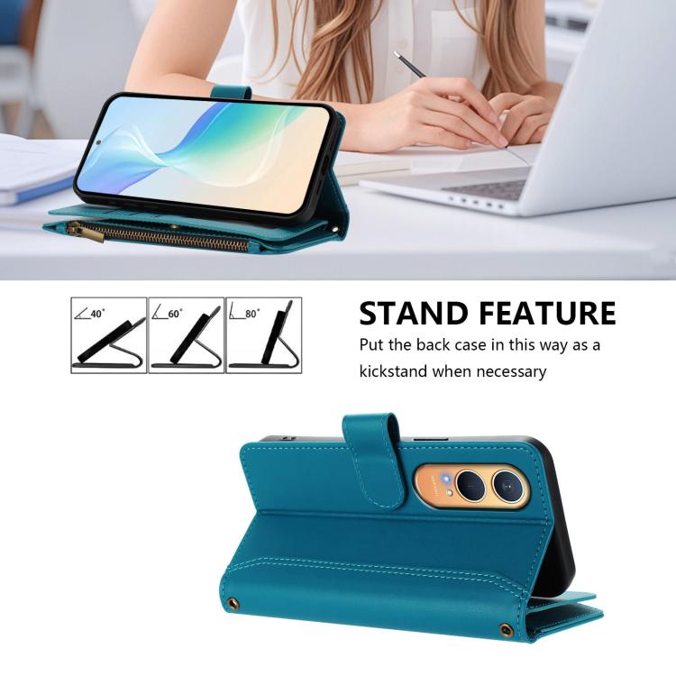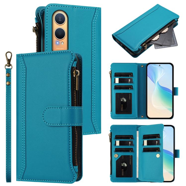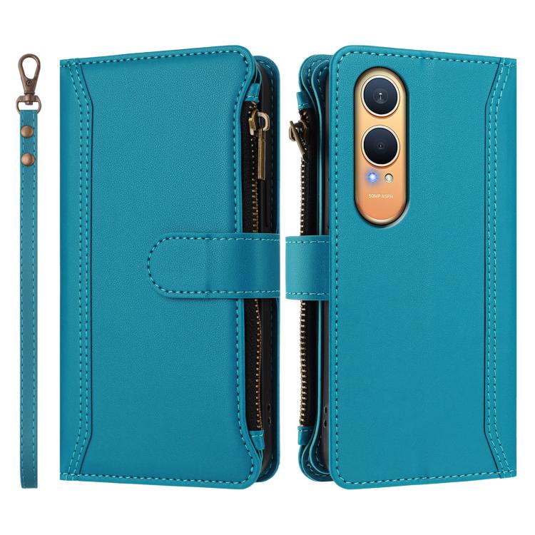 For OnePlus Nord CE4 Lite 5G Global Magnetic Closure 9 Card Slots Zipper Leather Case with Hand Strap(Turquoise)