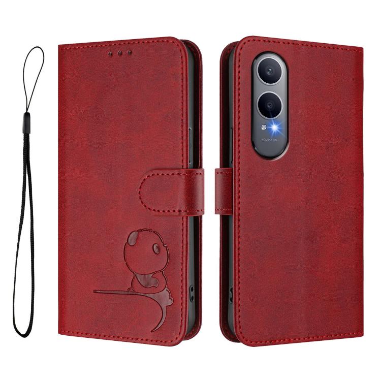 For OnePlus Nord CE4 Lite Litter Panda Embossing RFID Leather Phone Case with Lanyard(Wine Red)