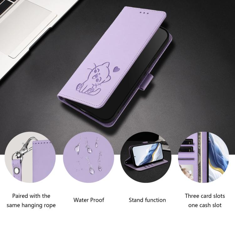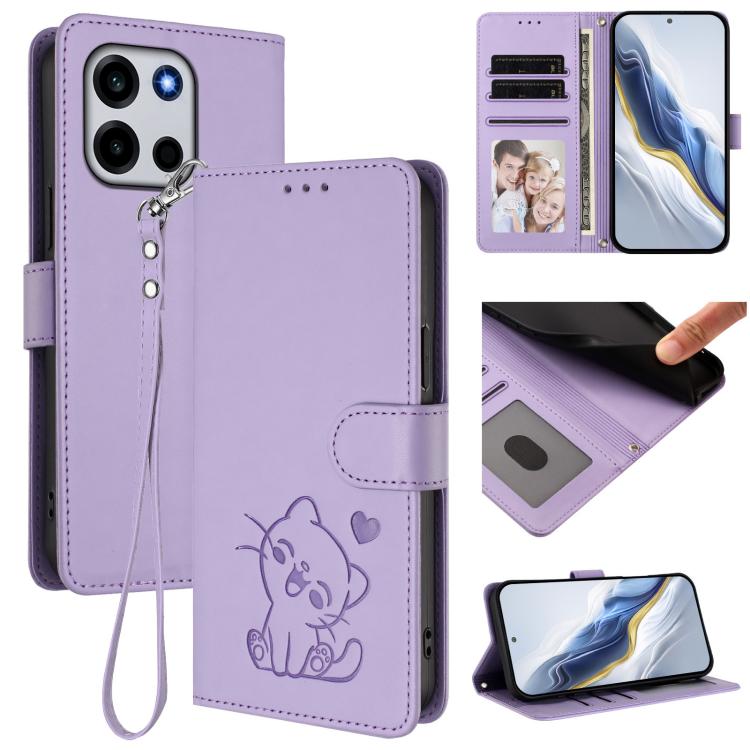 For OnePlus Turbo 6 / 6V 5G Embossed Heart Cat Leather Phone Case with Hand Strap(Light Purple)