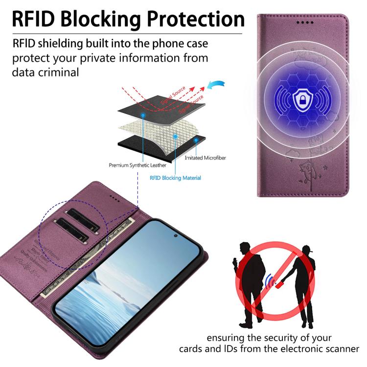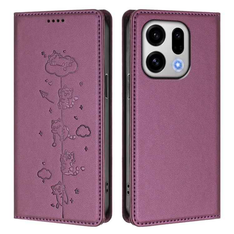 For OPPO Find X9 Cute Cats Embossed Magnetic RFID Vegan Leather Phone Case(Violet Purple)