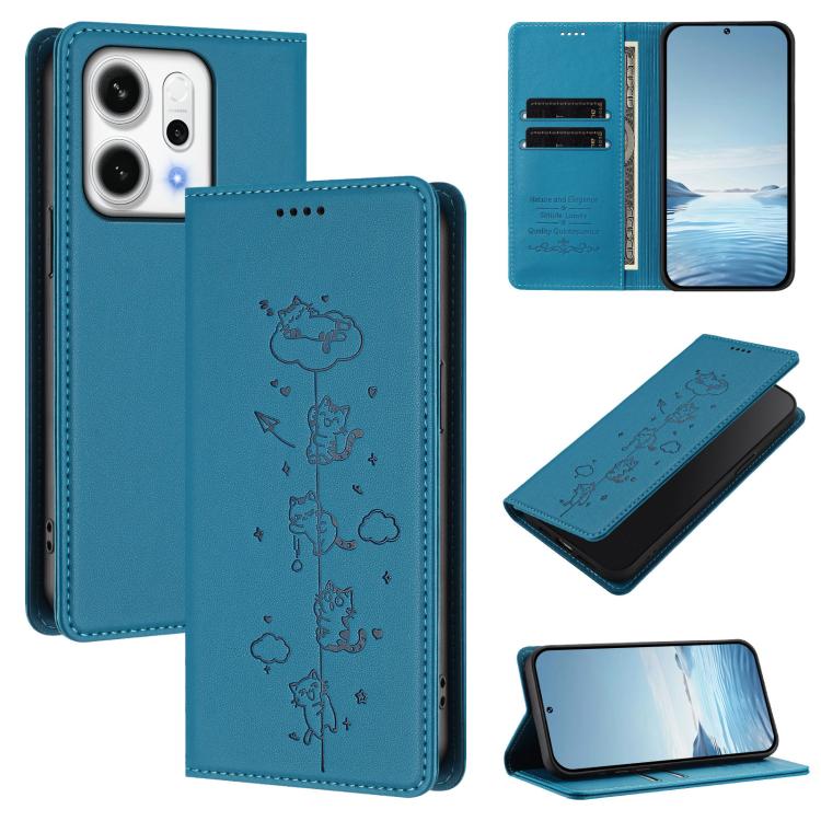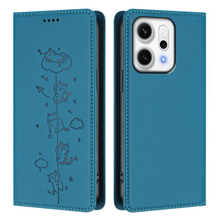 For OPPO Reno14 F 5G / Reno14 5G Global Cute Cats Embossed Magnetic RFID Vegan Leather Phone Case(Lake Blue)