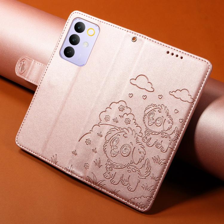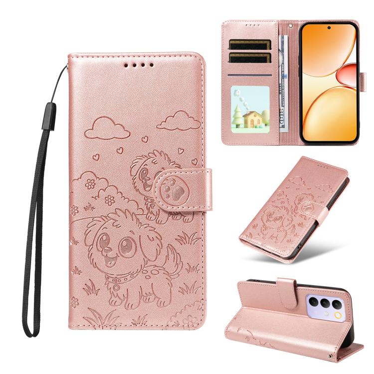 For Realme C85 Pro 4G Embossed Heart Dog RFID Blocking Wallet Leather Phone Case(Rose Gold)