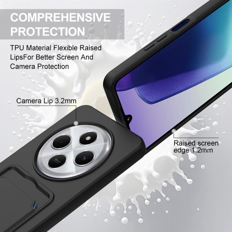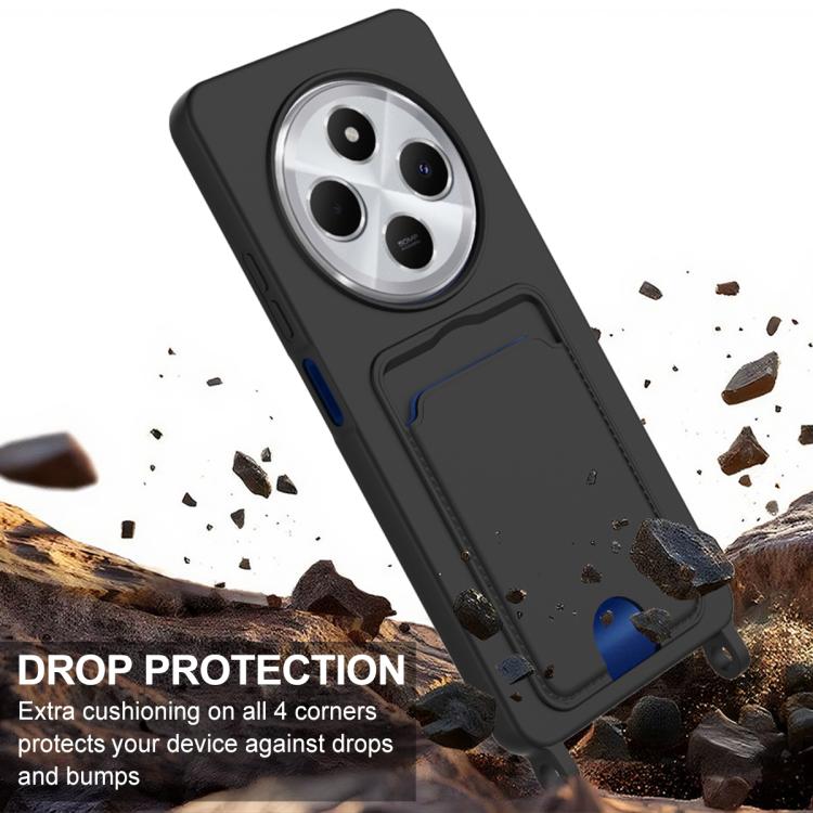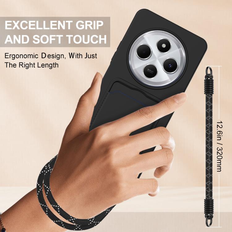 For Redmi 14C 4G / 14R 5G / A4 5G Integrated Card Bag Solid Color Liquid Silicone Phone Case Gen2 with Short Lanyard(Black)
