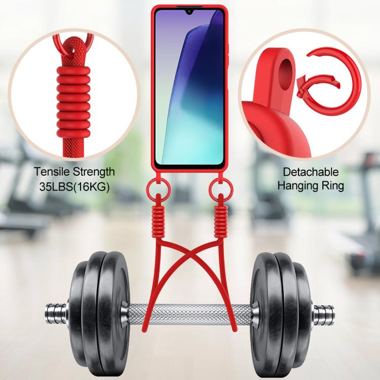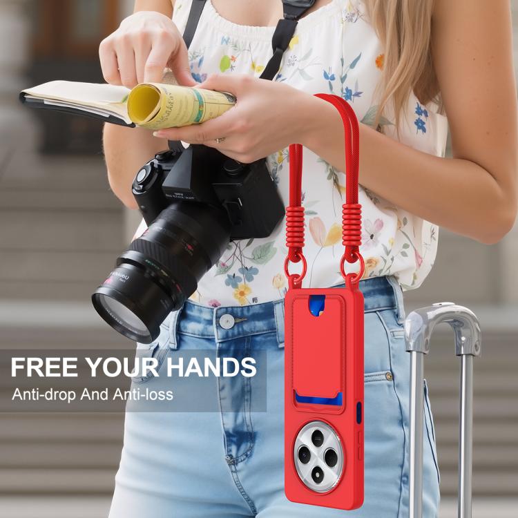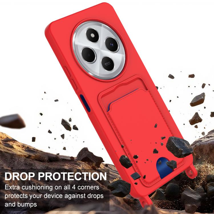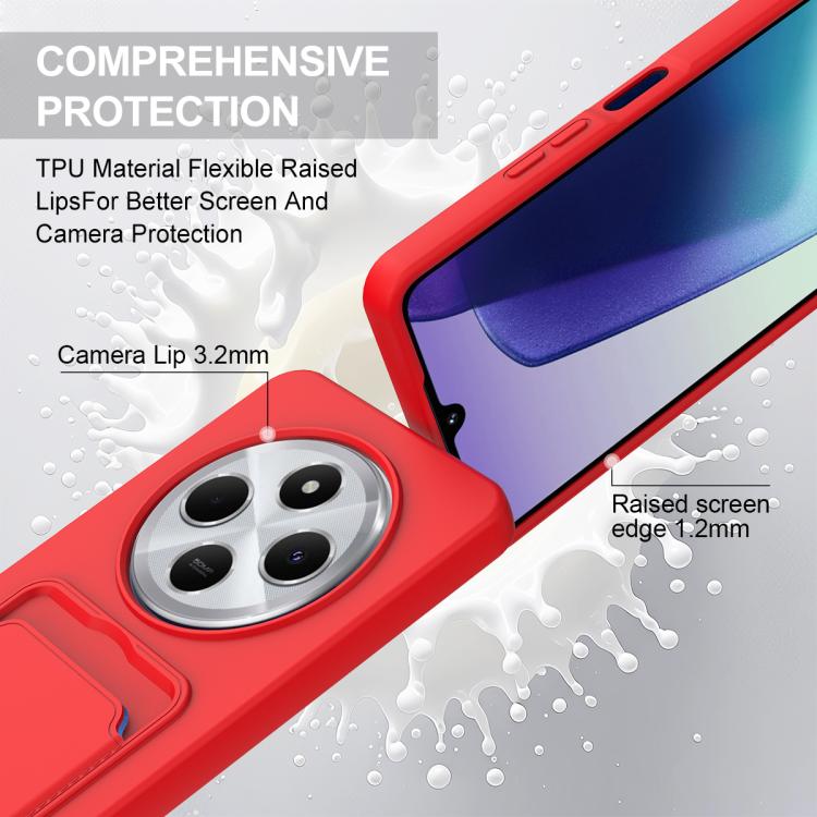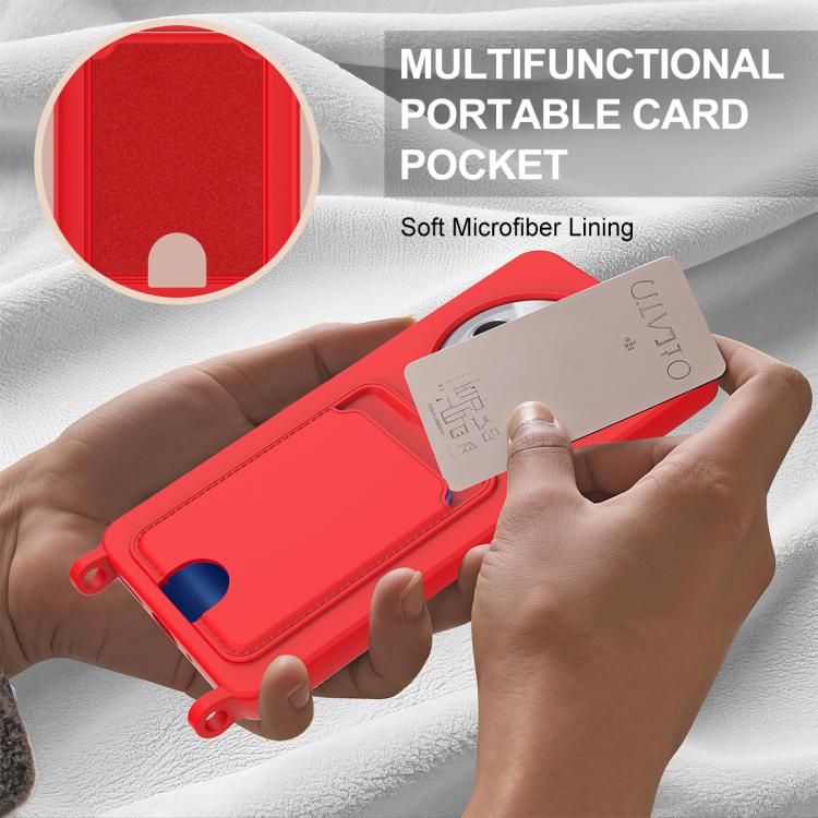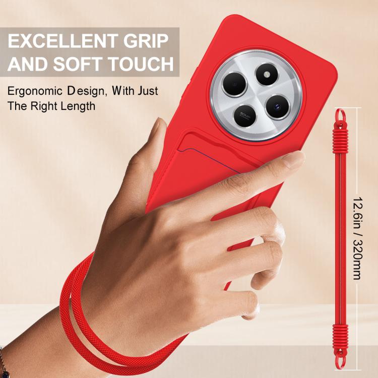 For Redmi 14C 4G / 14R 5G / A4 5G Integrated Card Bag Solid Color Liquid Silicone Phone Case Gen2 with Short Lanyard(Red)