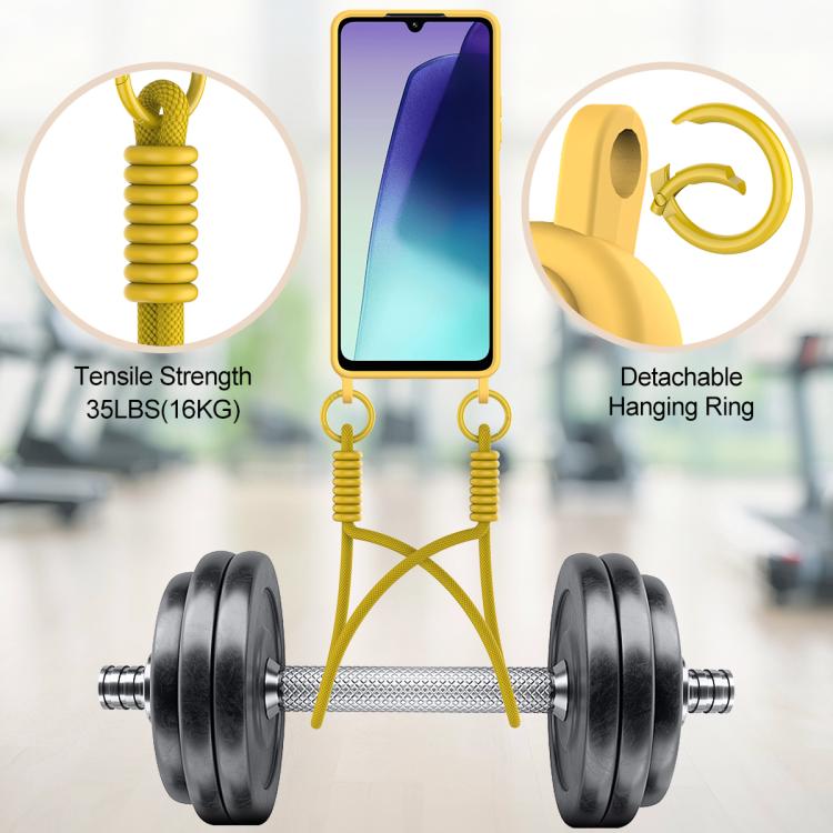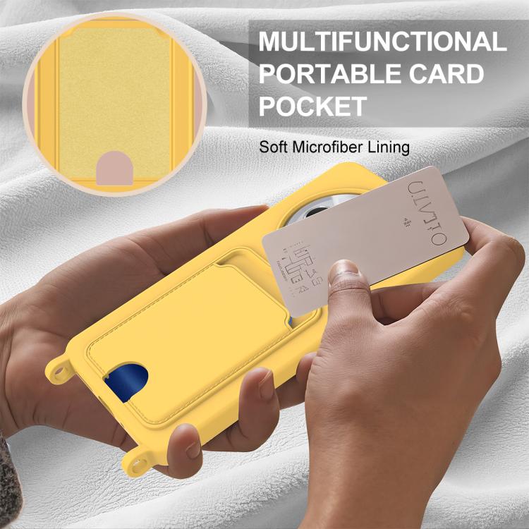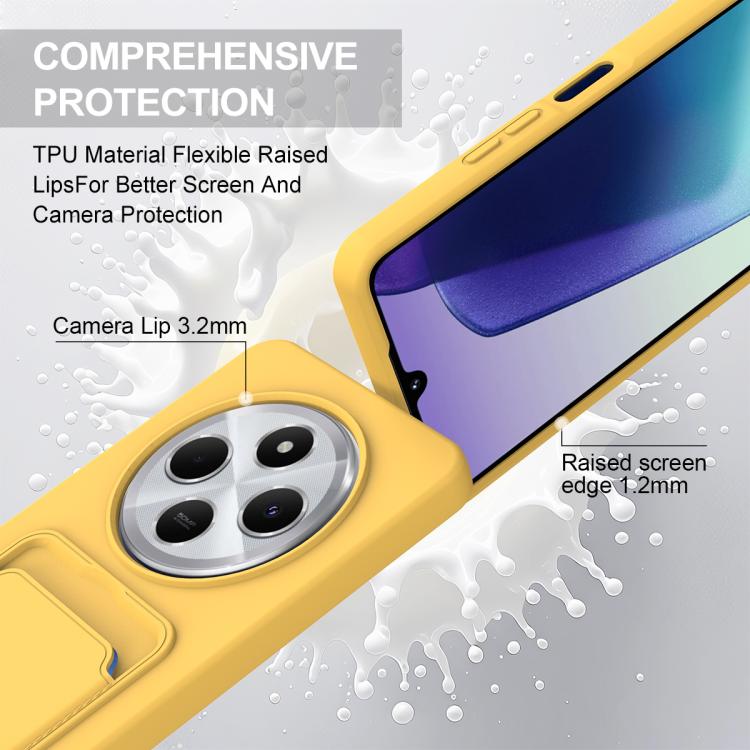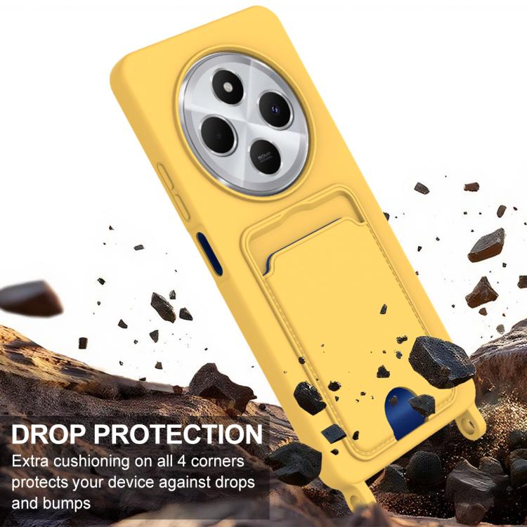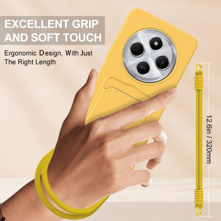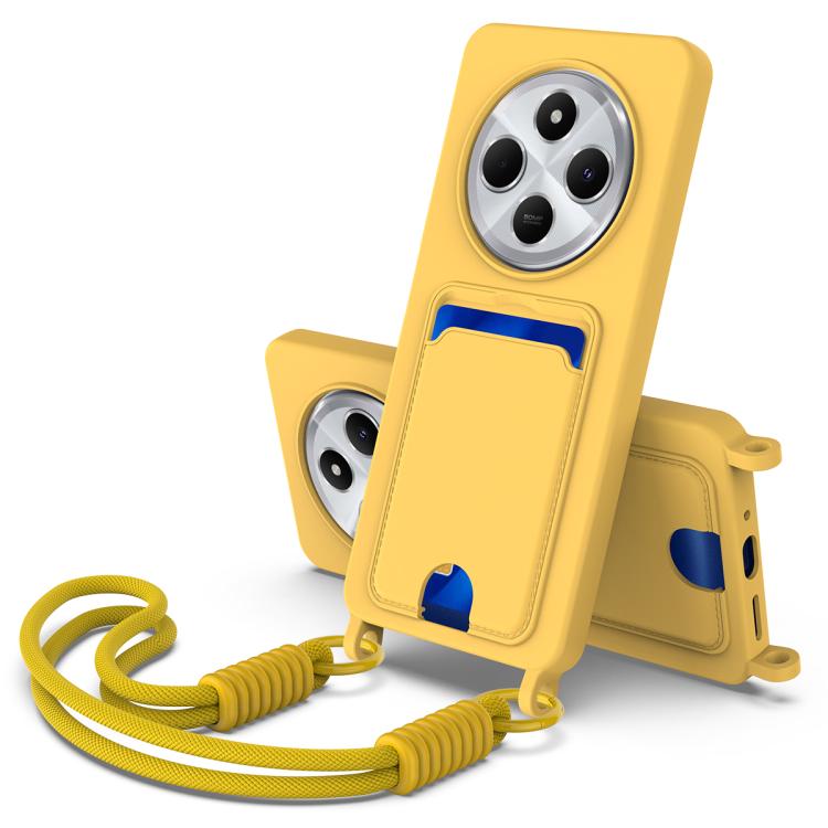 For Redmi 14C 4G / 14R 5G / A4 5G Integrated Card Bag Solid Color Liquid Silicone Phone Case Gen2 with Short Lanyard(Yellow)