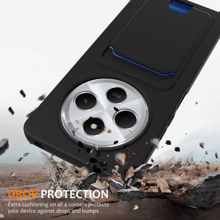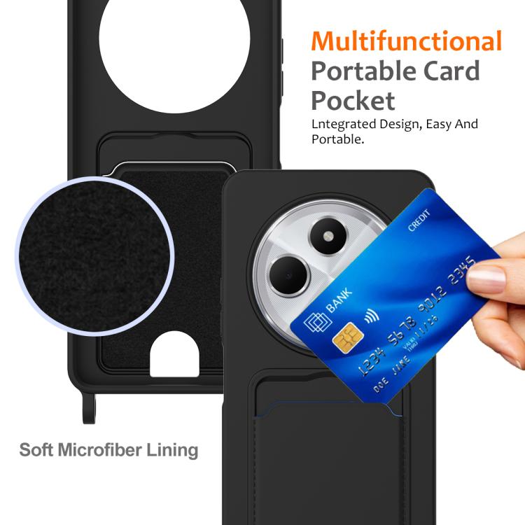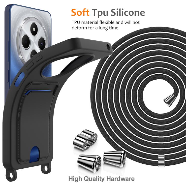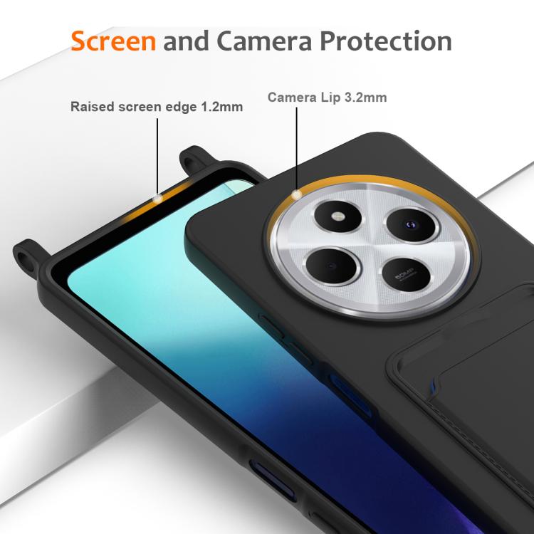 For Redmi 14C 4G / 14R 5G / A4 5G Integrated Card Bag Solid Color Liquid Silicone Phone Case with Lanyard(Black)
