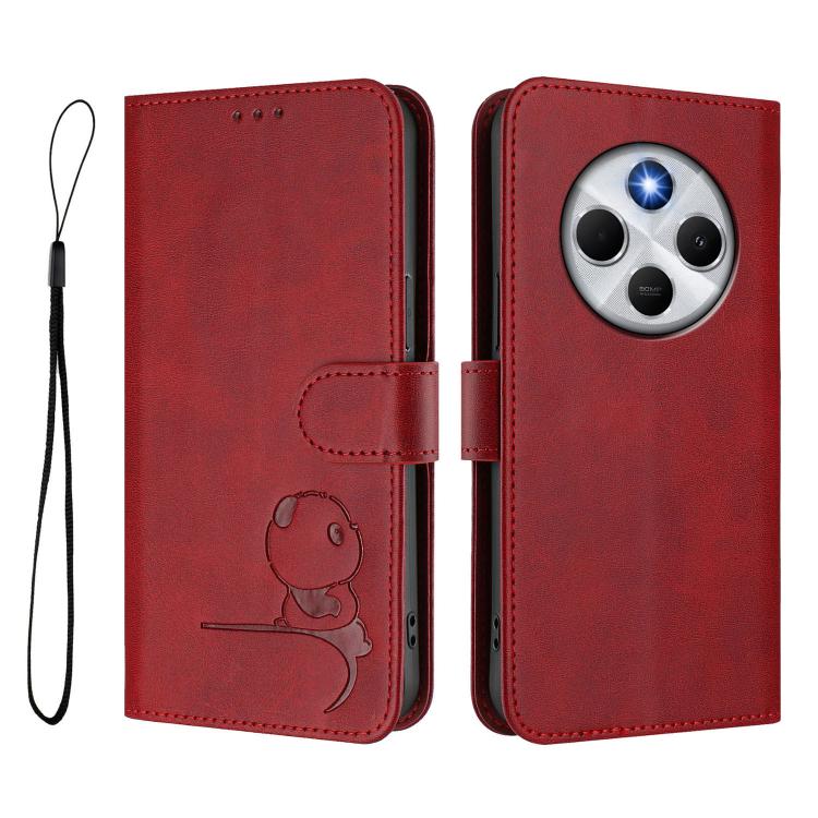 For Redmi 14C 4G / 14R 5G / A4 5G Litter Panda Embossing RFID Leather Phone Case with Lanyard(Wine Red)